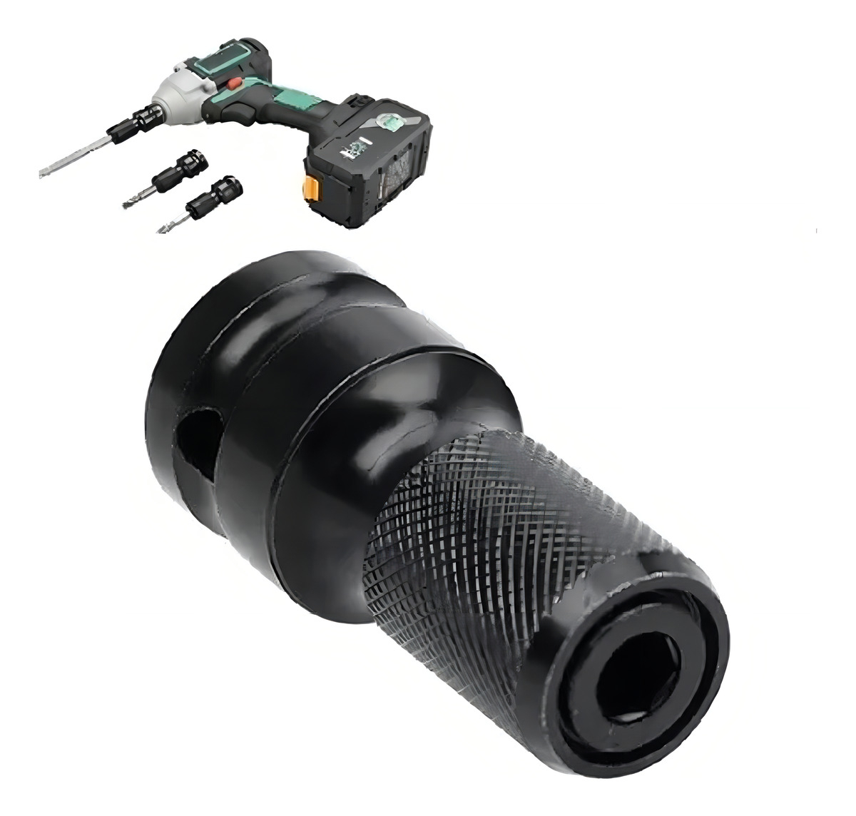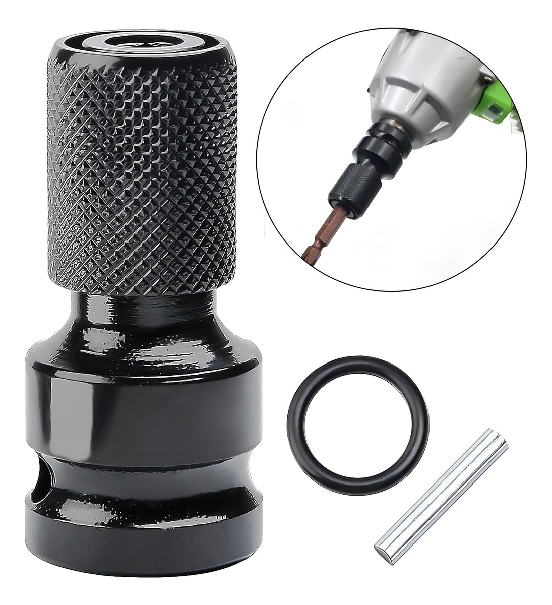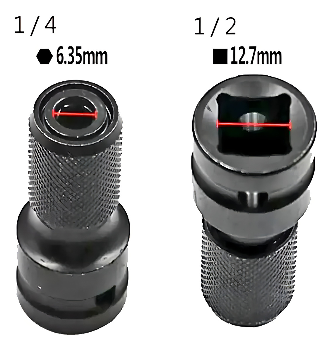 Este es un adaptador para llaves de impacto de 1/4 de pulgada, diseñado para usarse con brocas con un conector de 1/2 pulgada. Se puede conectar a herramientas neumáticas para su uso con brocas, lo que facilita y agiliza el trabajo. La instalación es sencilla, basta con deslizar un lado de la herramienta eléctrica y el otro lado se puede fijar a la broca que prefiera. Está fabricado en acero al carbono con revestimiento de electroforesis.