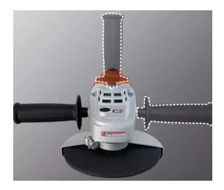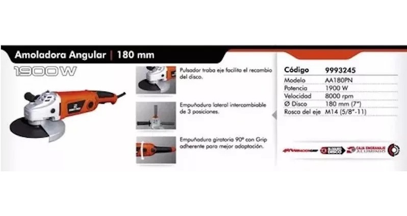 Amoladora Angular de 180mm con traba de eje para facilitar el recambio de disco. Empuñadura lateral intercambiable en 3 posiciones y sistema de ventilación frontal. Empuñadura giratoria 90º con grip adherente para mejor adaptación.