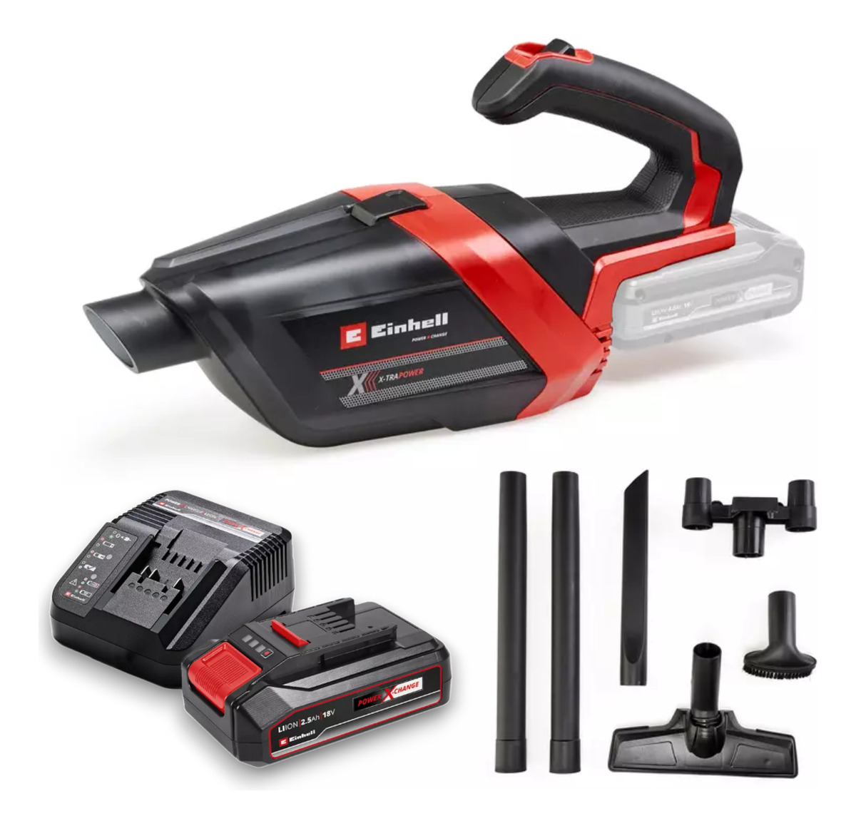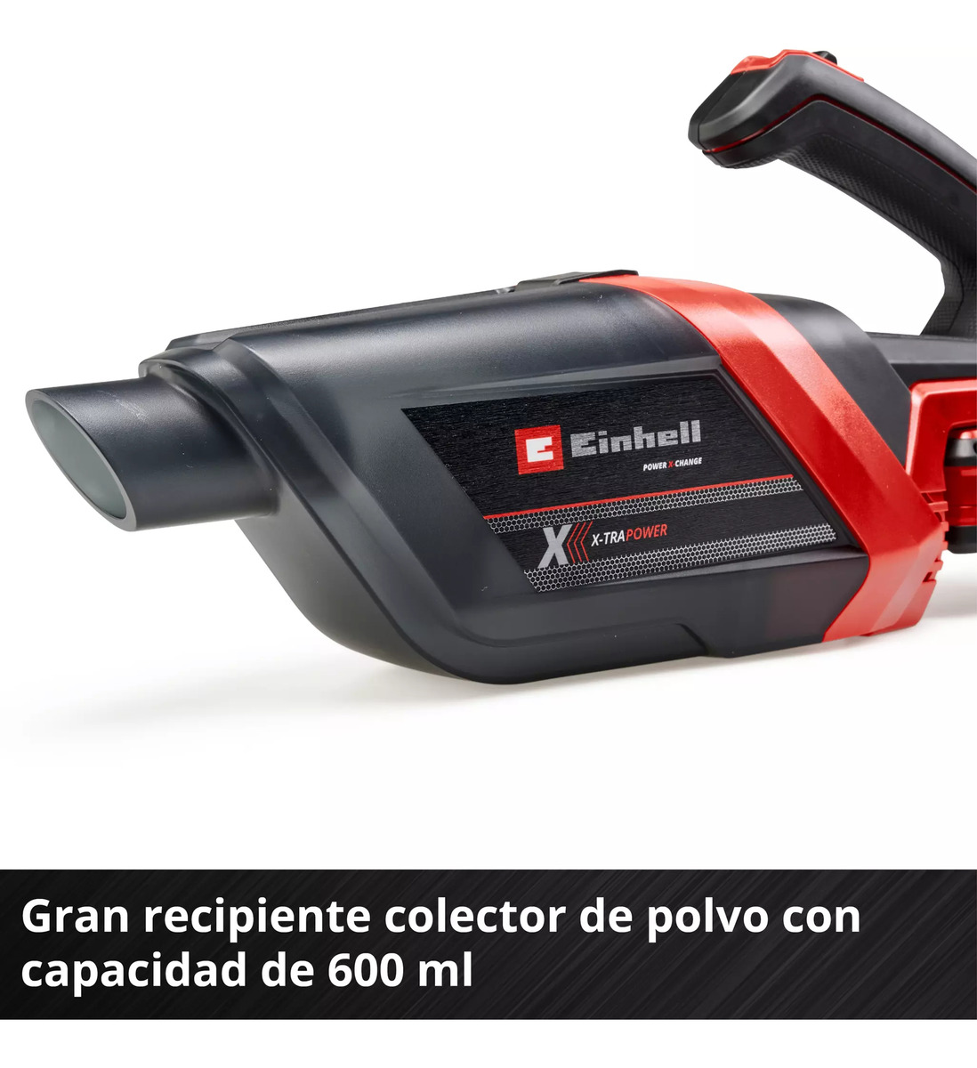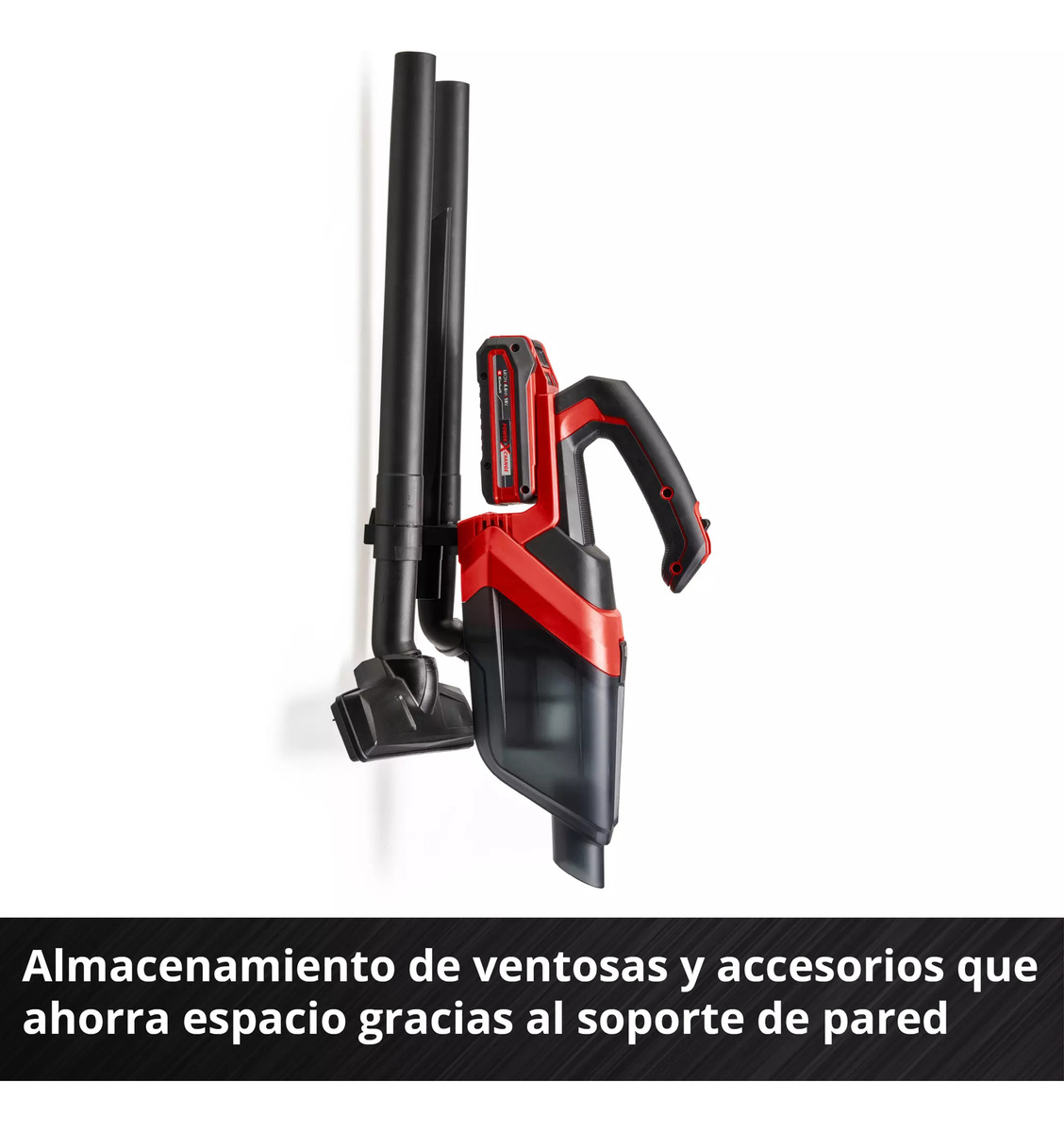 El aspirador de polvo manual con batería TE-HV 18/06 Li-Solo de Einhell es un ayudante ligero y compacto, siempre al alcance de la mano para retirar suciedad y migas molestas. El paquete de fuerza manejable es parte de la potente familia Power X-Change de Einhell en la que pueden combinarse flexiblemente las baterías, cargadores y equipos de sistema. El aspirador de mano limpia rápidamente cualquier superficie gracias a sus tres boquillas contenidas en el alcance del envío. La boquilla para suelos es especialmente adecuada para suelos duros y superficies lisas. La boquilla de tapicería es adecuada para tapicería, asientos de coche y telas. Con la boquilla de juntas de 26 cm también pueden limpiarse puntos difícilmente accesibles sin gran esfuerzo. Con la ayuda de dos tubos de aspiración contenidos en el alcance del envío (longitud total 70 cm), el práctico aspirador de mano con batería también se puede usar como aspirador de suelo y así cómodamente en posición vertical. El recipiente colector de polvo dispone de una capacidad de 600 ml y puede vaciarse fácilmente presionando un botón. El soporte de pared integrado garantiza un almacenamiento que permite ahorrar espacio. El ligero aspirador de 1 kg queda agradable y fácilmente en la mano por la forma constructiva ergonómica y superficies de agarre suave. El filtro de suciedad integrado se puede limpiar con agua corriente y reutilizarse tras secarse completamente.