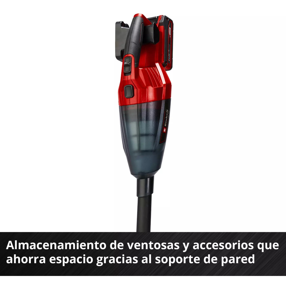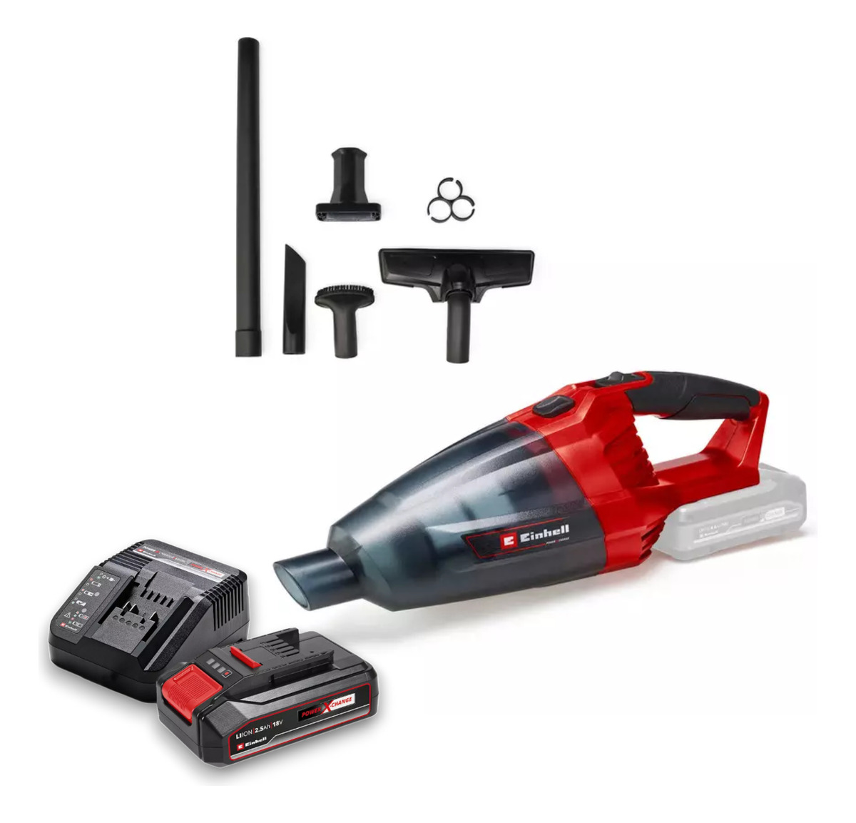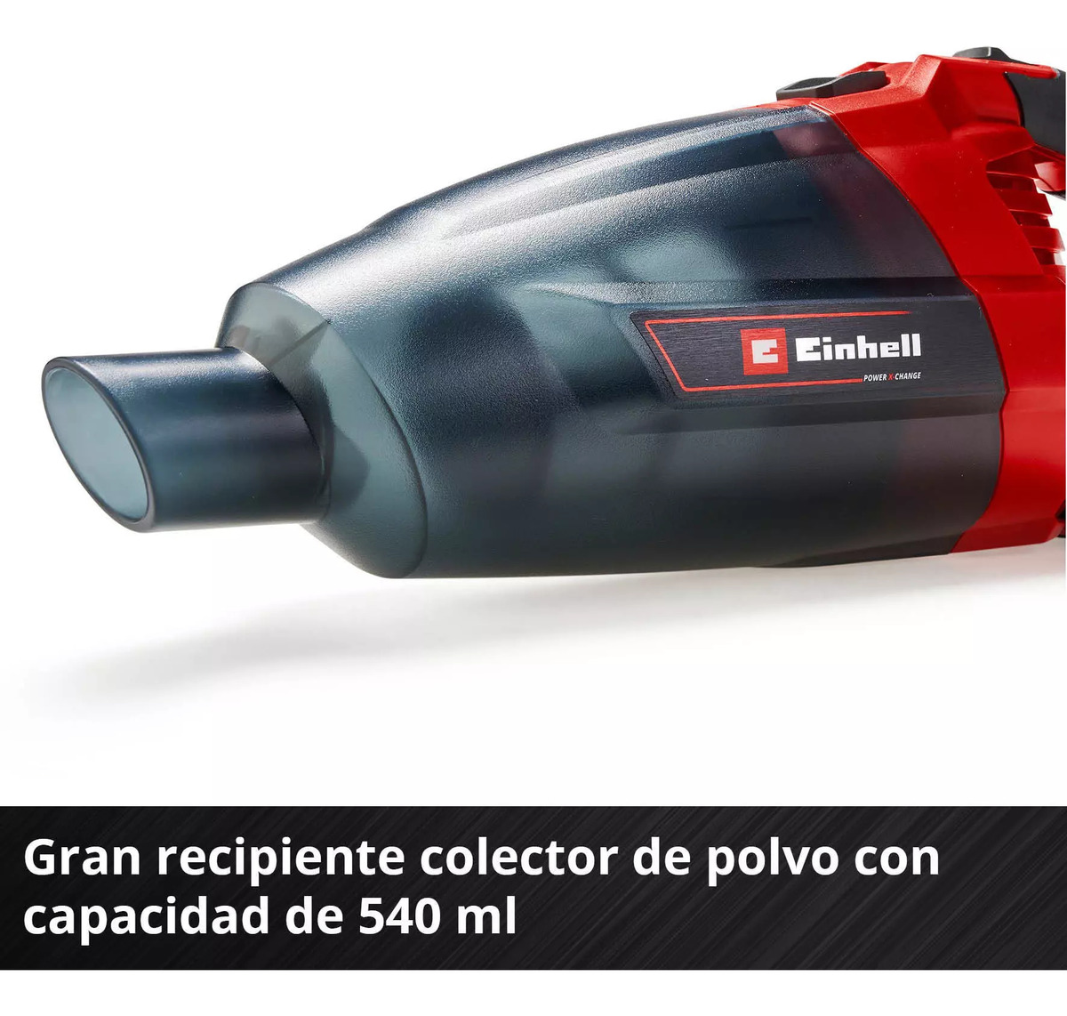 El aspirador de mano sin cable Einhell TE-VC 18 Li-Solo está siempre a mano para limpiar la suciedad y las molestas migas de la alfombra, el sofá o la mesa. Este práctico aspirador pertenece a la familia Power X-Change de Einhell, de eficacia probada. Las baterías recargables de esta serie pueden utilizarse en cualquiera de los productos de la familia del sistema. Los rangos de trabajo cortos, una gran colección de baterías y cargadores diferentes y el bajo rendimiento son cosa del pasado. El aspirador de mano sin cable limpia cualquier superficie en un abrir y cerrar de ojos gracias a las tres boquillas incluidas. La boquilla para suelos está especialmente diseñada para suelos duros y superficies lisas. Hay una segunda boquilla para tapicerías y tejidos. Con la boquilla para hendiduras también puede limpiar zonas de difícil acceso con poco esfuerzo. El tubo de extensión de 46,5 cm le facilita el uso de la cómoda aspiradora sin cable para limpiar los suelos mientras está de pie. El depósito de polvo tiene una capacidad de 540 mililitros. Para ahorrar espacio hay un soporte de pared integrado.