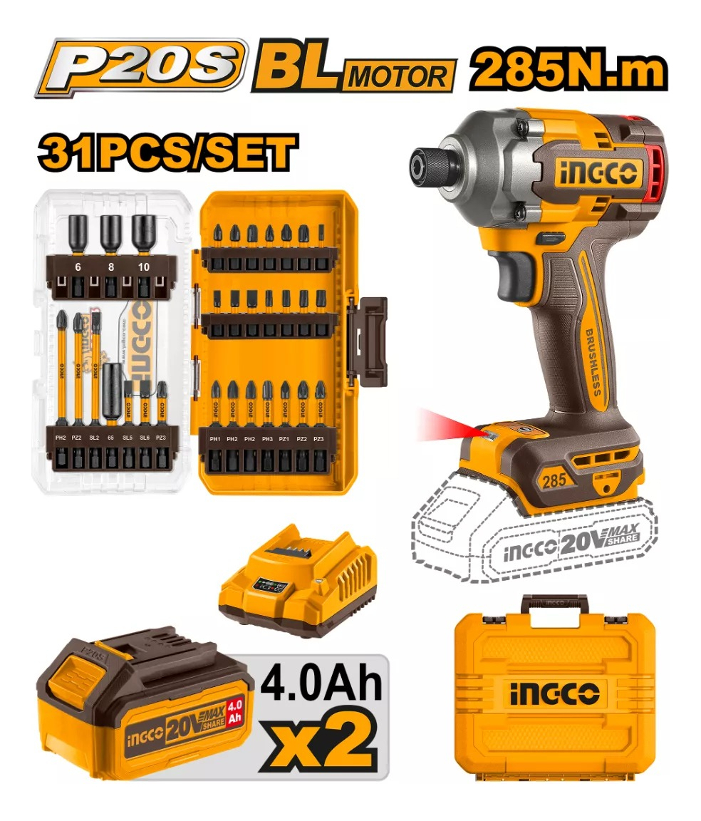 ATORNILLADOR DE IMPACTO 285NM 20V BATERIA P20S + JUEGO 31 PUNTAS Y DADOS C BAT Y VALIJA