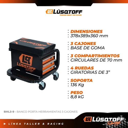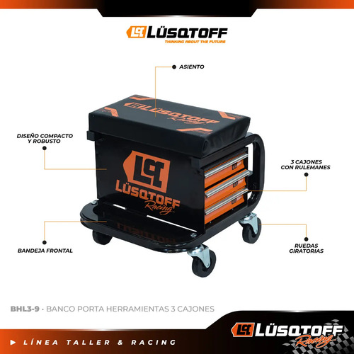 Banco Porta Herramientas LÜSQTOFF BHL3-9, una solución compacta y robusta diseñada para la máxima comodidad y organización en tu taller o garaje. Este versátil banco con ruedas te permite tener tus herramientas siempre al alcance de la mano.