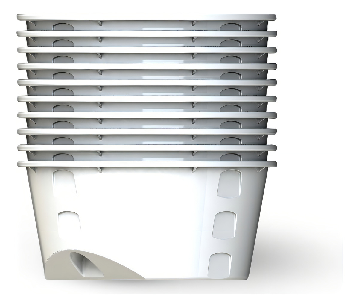 Fondo con ángulos para un mejor arrastre. Fácil de transportar y apilar por su tamaño, modulación y peso.