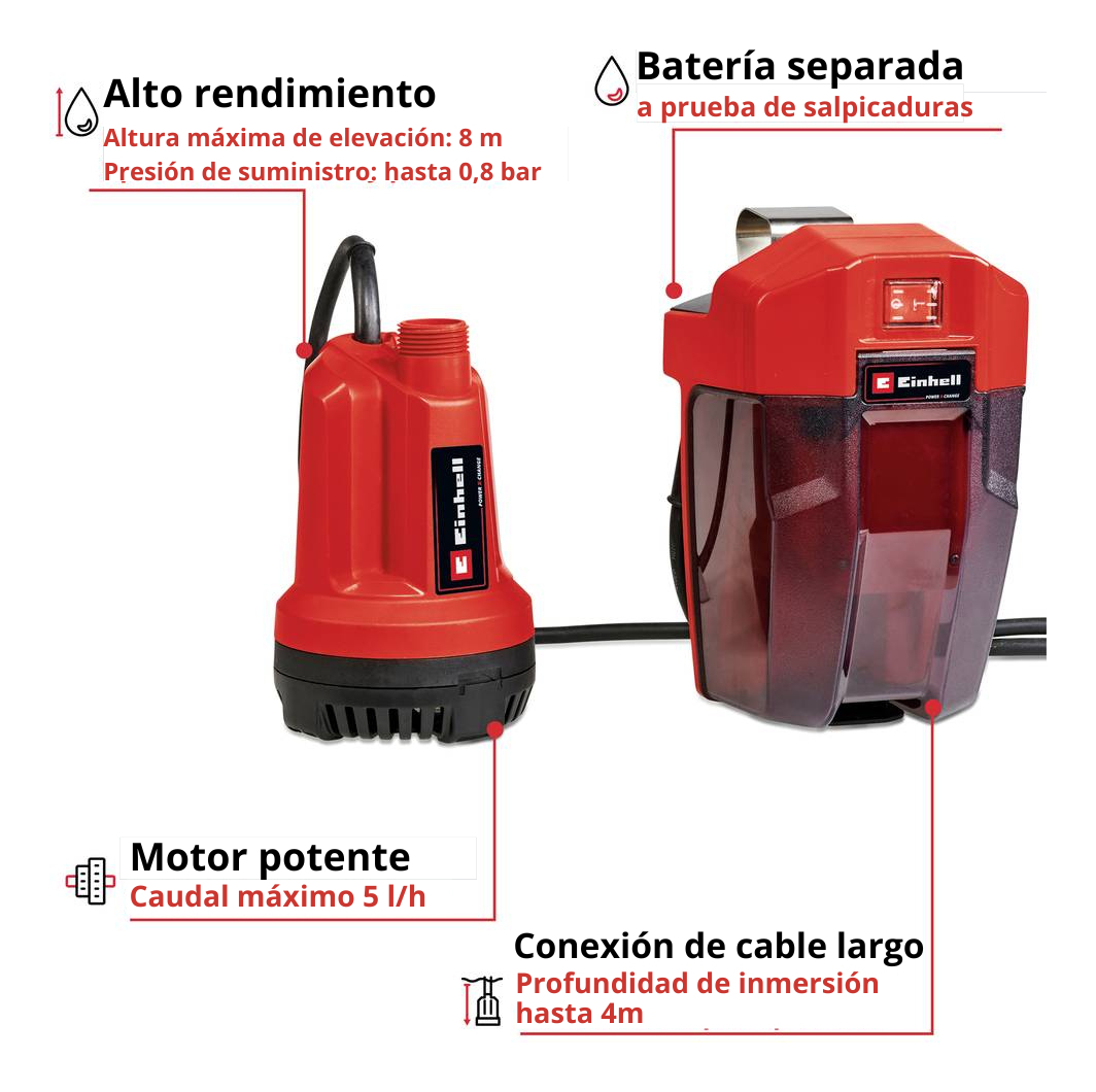 La bomba de agua limpia inalambrica GE-SP 18 Li es un miembro de alto rendimiento de la familia Power X-Change de alta calidad alimentada por iones de litio. Esta bomba es ideal para su uso en el jardín, y en cualquier lugar en el que desee mover el agua sin necesidad de conectarse a la red eléctrica. El largo cable de conexión a la caja de la batería permite una mayor profundidad de inmersión: Para bombear y repostar agua independientemente de la red eléctrica, con flexibilidad de uso y un potente funcionamiento. El motor de alto rendimiento bombea agua limpia a un ritmo de hasta 5.000 litros por hora. La caja de la batería, protegida contra las salpicaduras, con dispositivo de suspensión y posibilidad de montaje en la pared, está equipada con un cómodo soporte para guardar los cables en la carcasa. La carcasa de la bomba de alta calidad con conexión de manguera de fácil acceso en la parte superior de la bomba y la innovadora caja de la batería están fabricadas en plástico resistente a los impactos. Para su funcionamiento se necesita una batería recargable de 18 V de la serie Power X-Change, que no se suministra con el producto. La batería recargable y el cargador están disponibles por separado, por ejemplo, como un práctico juego de inicio.