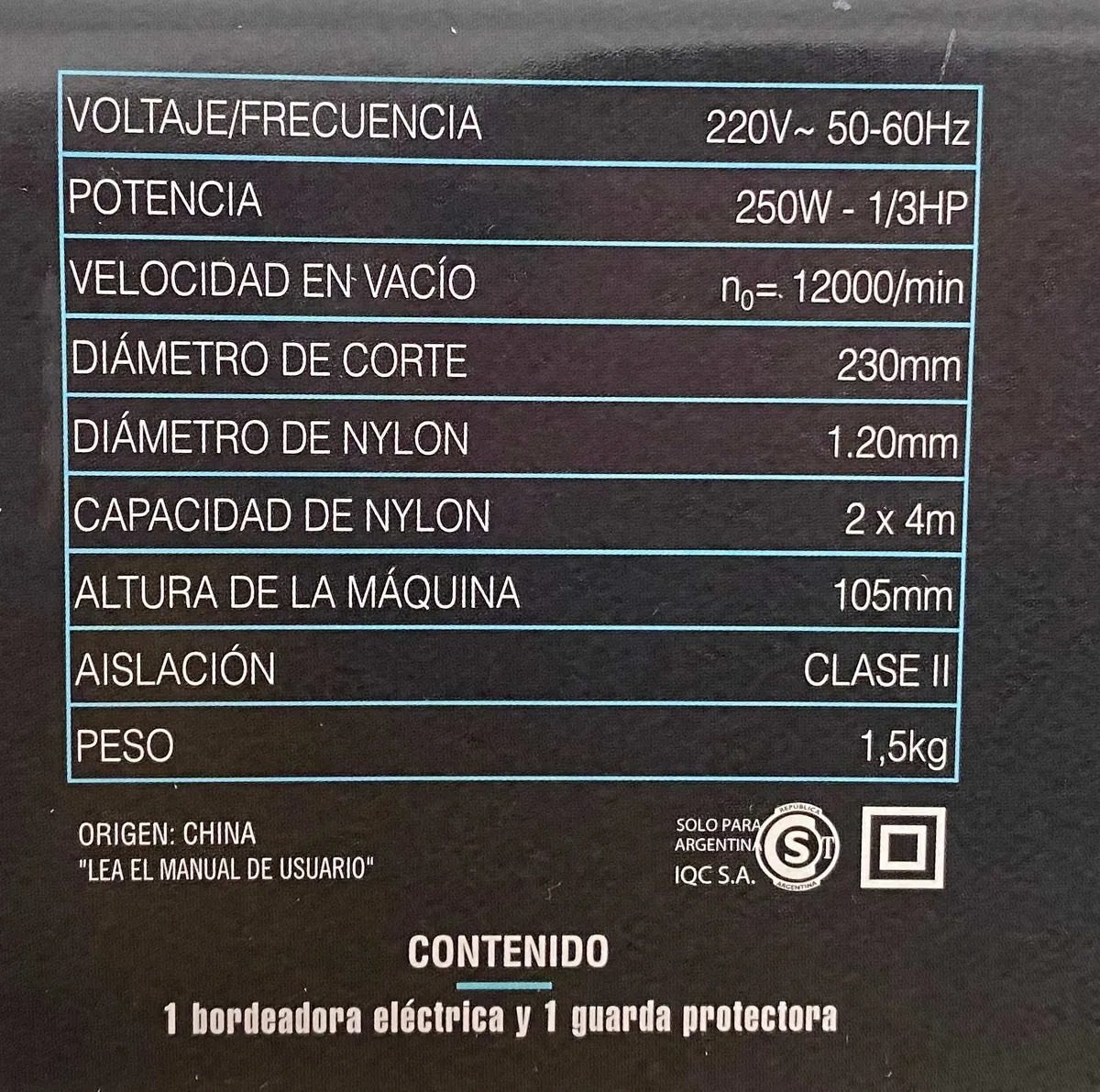 Voltaje/Frecuencia: 220V~ 50-60HzPotencia: 250W – 1/3HPVelocidad en vacío:12000/minDiámetro de corte: 230mm-10?Diámetro de nylon: 1,2mmCapacidad de nylon: 2 x 4mAltura: 105mmAislación: CLASE IIPeso: 3,6kgGarantía: 1 año