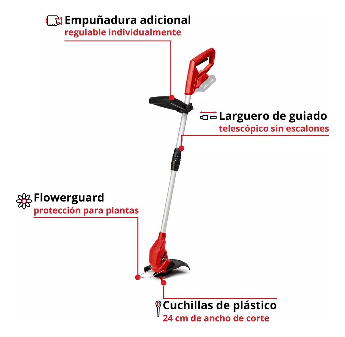 Con la recortadora de césped con batería GC-CT 18/24 Li – Solo de Einhell se puede dar forma rápidamente al jardín y superficies de césped con esquinas y bordes. El verde doméstico se recorta de forma rápida y cómoda, y esto de manera totalmente flexible. La recortadora de césped con batería es un potente miembro de la serie del sistema Power X-Change. Las baterías de la familia del sistema se pueden utilizar en todos los aparatos de la serie en la zona del jardín y taller. La recortadora de césped está equipada con el dispositivo Flowerguard de Einhell. Las flores y plantas ornamentales se protegen de forma efectiva contra el deterioro. El larguero guía telescópico sin escalonamiento se ajusta completamente a las necesidades del jardinero doméstico y permite así trabajar sin fatiga. Con un giro de la cuchilla de 8.500 rpm, la recortadora de césped con batería es un ayudante equipado de forma enérgica y proporciona un verde cuidado en el césped, zonas exteriores y puntos difícilmente accesibles en el jardín. La anchura de corte de la cuchilla es de 24 centímetros. Al alcance del envío pertenecen 20 unidades de cuchillas de plástico. La batería Power X-Change y el cargador son adquiribles por separado, por ejemplo, como práctico set para principiantes.