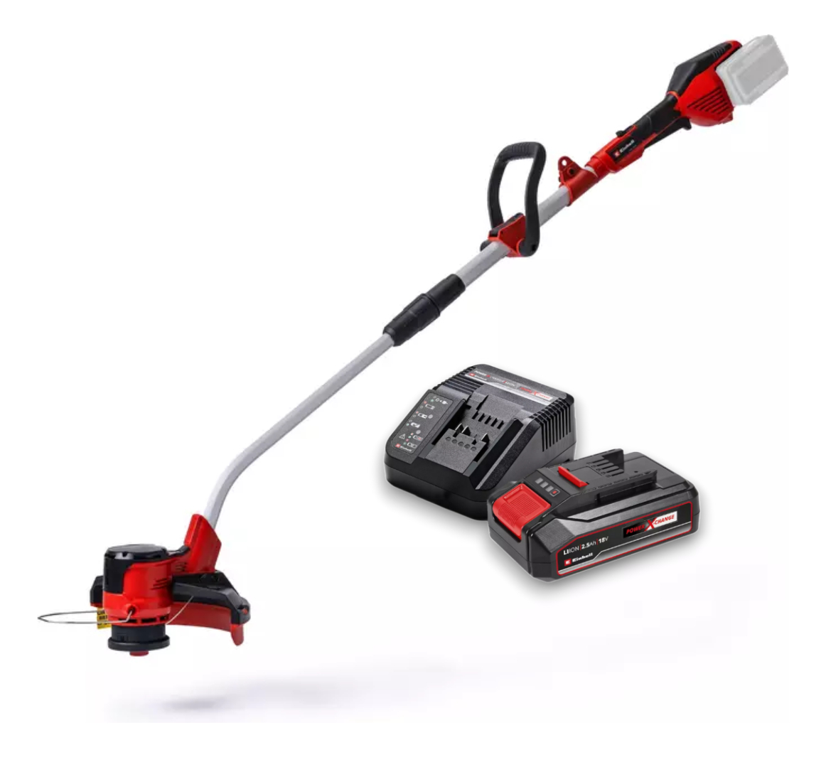 El cortabordes inalámbrico Einhell GE-CT 36/30 Li E – Solo es un ayudante probado en el cobertizo de herramientas para el jardinero aficionado. Tanto si se trata de recortar bordes como de poner en forma el césped, el potente cortabordes sin cable realiza su trabajo con rapidez gracias a la regulación electrónica de la velocidad. Forma parte de la familia Power X-Change. Las baterías pueden utilizarse en todas las herramientas de esta serie. Se necesitan 2 baterías de 18 V para hacer funcionar el cortabordes sin cable. El mango largo de aluminio moldeado elimina la fatiga del trabajo. El eje dividido facilita el transporte y reduce el espacio de almacenamiento necesario. La empuñadura adicional ajustable está dotada de un bloqueo rápido. El carrete de un hilo con sistema de alimentación por tope ofrece una anchura de corte de hasta 30 centímetros. Las características de equipamiento, como la correa de transporte, el soporte de pared y la empuñadura suave, hacen que el cortabordes inalámbrico sea un ayudante versátil y cómodo en el jardín. El protector de flores garantiza siempre la distancia de seguridad necesaria respecto a las flores y plantas ornamentales, preservando la belleza del jardín.