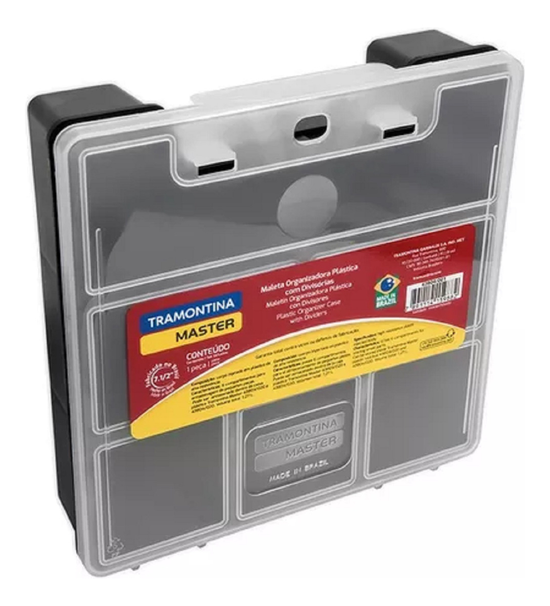 Para almacenamiento y transporte de herramientas, equipos de pesca y otros accesorios. Cuenta con 6 compartimentos internos. Tapa transparente. Volumen total 1.27 Litros, dimensiones 19×18.5x5cm. TRAMONTINA TN0832