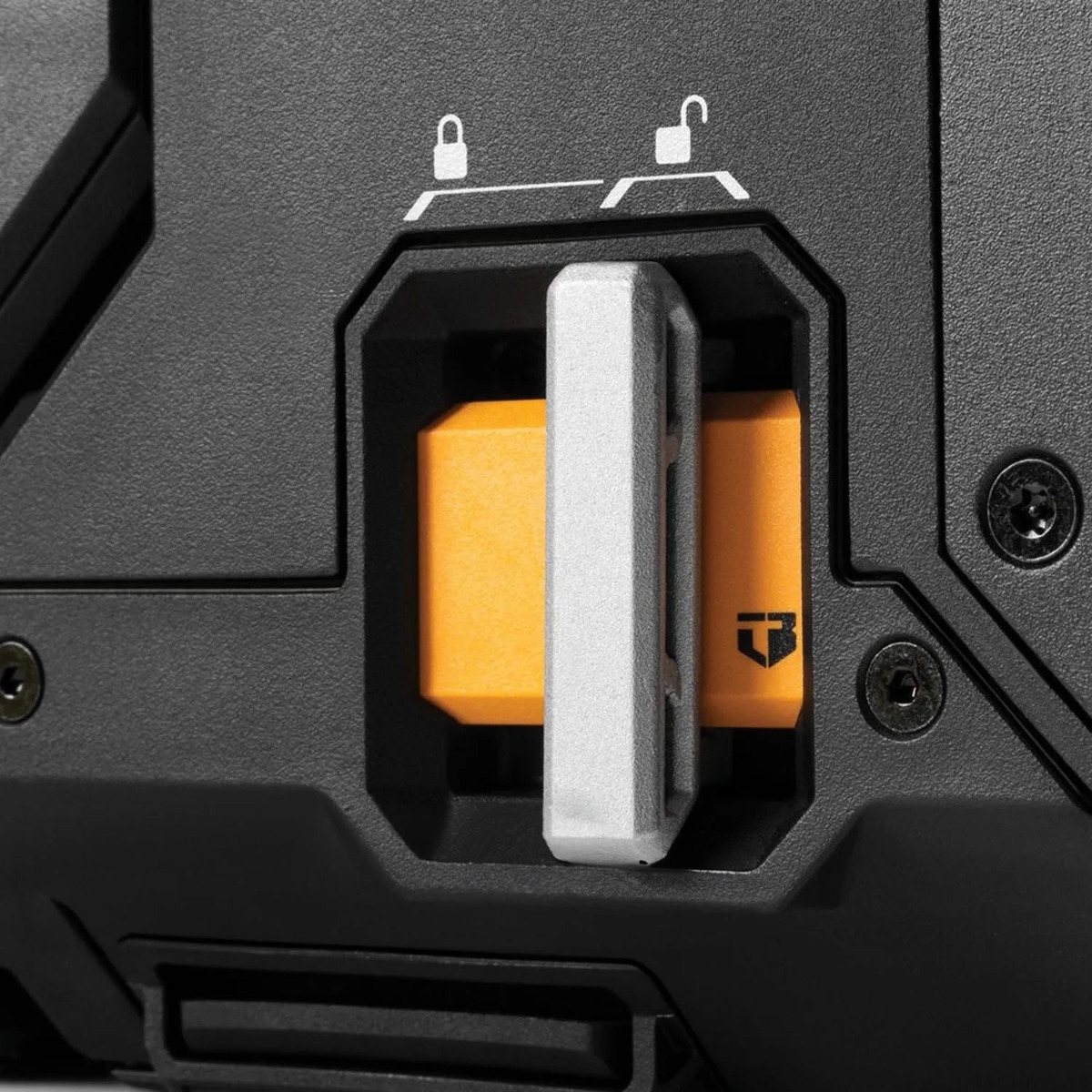 – BOTÓN DESLIZANTE: Desbloquea la batería e indica claramente cuando está lista para el transporte.