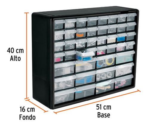 El Organizador con 44 Gavetas Resistente a Impactos de la marca Truper es la solución perfecta para mantener tus herramientas y accesorios en orden. Con una altura de 40 cm, un largo de 51 cm y un ancho de 16 cm, este organizador es compacto pero espacioso, lo que te permite almacenar una gran cantidad de ítems sin ocupar mucho espacio.