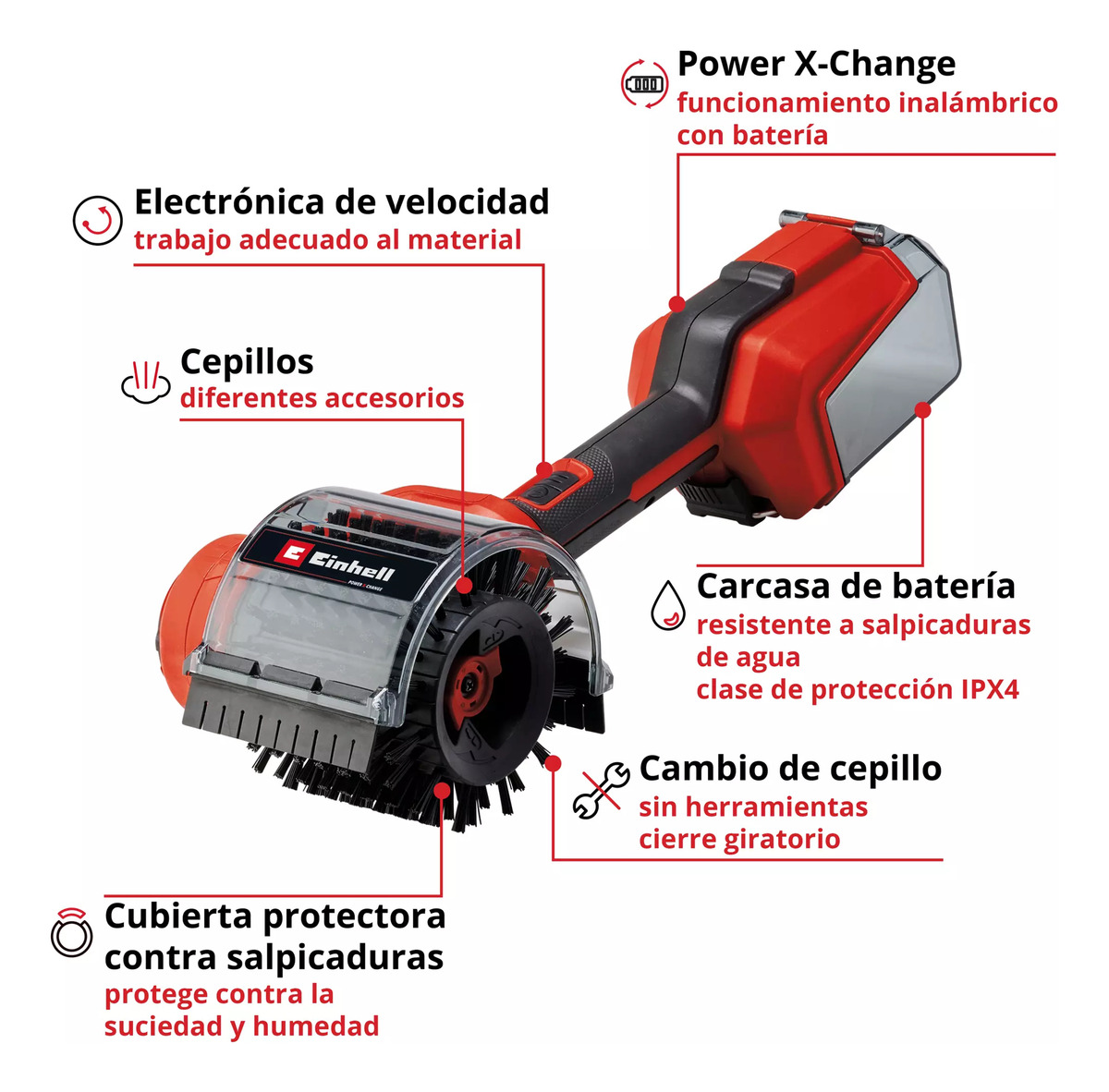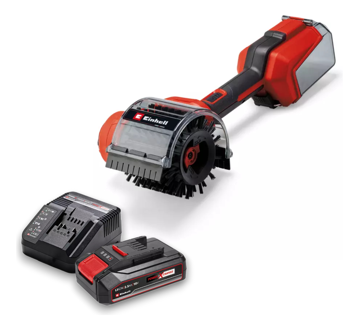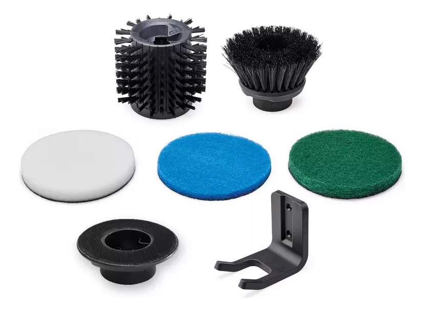 El cepillo de superficie con batería PICOBELLA 18/90 de Einhell es un ayudante versátil para la limpieza en interiores y exteriores, como en el jardín, en el garaje o en el hogar. Como miembro del sistema de batería Power X-Change combinable entre sí sin límites, cada batería del sistema se puede combinar con el cepillo de limpieza inalámbrico. Está equipado con un ajuste de velocidad de 2 niveles para poder trabajar de acuerdo con el material y la aplicación. Para que sea posible una limpieza en húmedo, el equipo está equipado con una cubierta con batería junto a anillo de sellado según la clase de protección contra el agua IPX4. De este modo, la batería Power X-Change se protege de forma óptima contra las salpicaduras de agua. El cepillo utilizado también puede estar provisto de una cubierta anti-salpicaduras extraíble con labio de goma. Esto protege contra salpicaduras de agua y suciedad durante la limpieza con el cepillo giratorio. Las superficies de agarre suave garantizan un trabajo antideslizante y cómodo. El alcance del envío contiene dos cabezales de cepillado: 1 cepillo MEDIUM 90/20 para la limpieza de superficies robustas como baldosas, piedra u hormigón y 1 cepillo SOFT 120/50 para la limpieza suave pero eficaz de diversas superficies como alféizares de ventanas, muebles de jardín o llantas de automóviles. Además, se incluyen tres almohadillas de limpieza diferentes, como 1 almohadilla de espuma de melamina blanca como borrador de suciedad sin detergente adicional para superficies lisas como vidrio, puertas/paredes y cuero, 1 almohadilla de microfibra azul para superficies delicadas como plástico, vidrio o metal y 1 almohadilla de fibra de cocina verde para eliminar la suciedad gruesa, óxido o cal en superficies robustas como vidrio templado y hierro fundido. Las almohadillas se pueden fijar al cepillo de limpieza con el soporte de almohadilla incluido. Los cepillos y almohadillas se cambian sin herramientas a través de un cierre rápido o de gancho y bucle. El soporte de pared suministrado permite un fácil almacenamiento del cepillo de superficie con batería.
