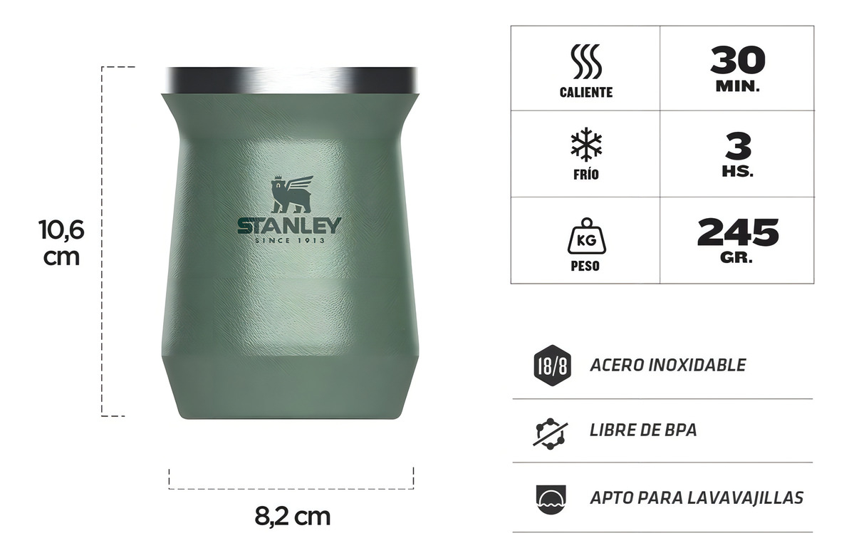2. Mate Stanley «Classic Mate» (230ml): El compañero perfecto para disfrutar de tu mate con comodidad y estilo en cualquier lugar. Fabricado con acero inoxidable de primera calidad y aislamiento al vacío, este mate mantiene la temperatura en cada cebada, garantizando un sabor excepcional en cada sorbo.