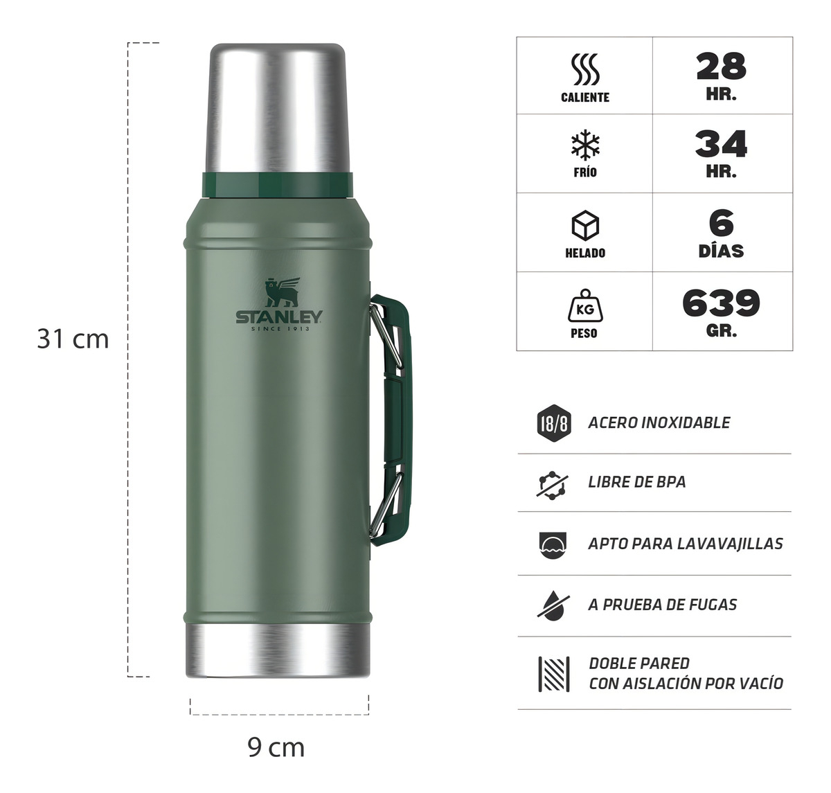 1. Termo Stanley «The Legendary Classic Bottle» (940ml): El compañero legendario que ha estado presente en innumerables aventuras. Con su construcción robusta y aislamiento al vacío, este termo mantiene tus bebidas calientes o frías durante más de 24 horas, permitiéndote disfrutar de tus líquidos favoritos sin importar dónde te lleve el camino.