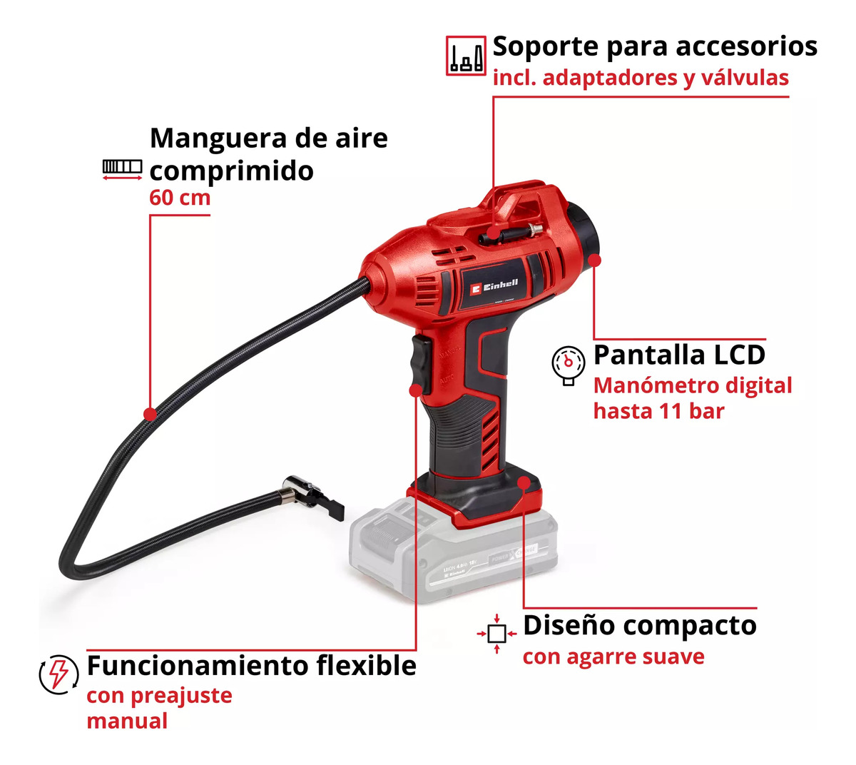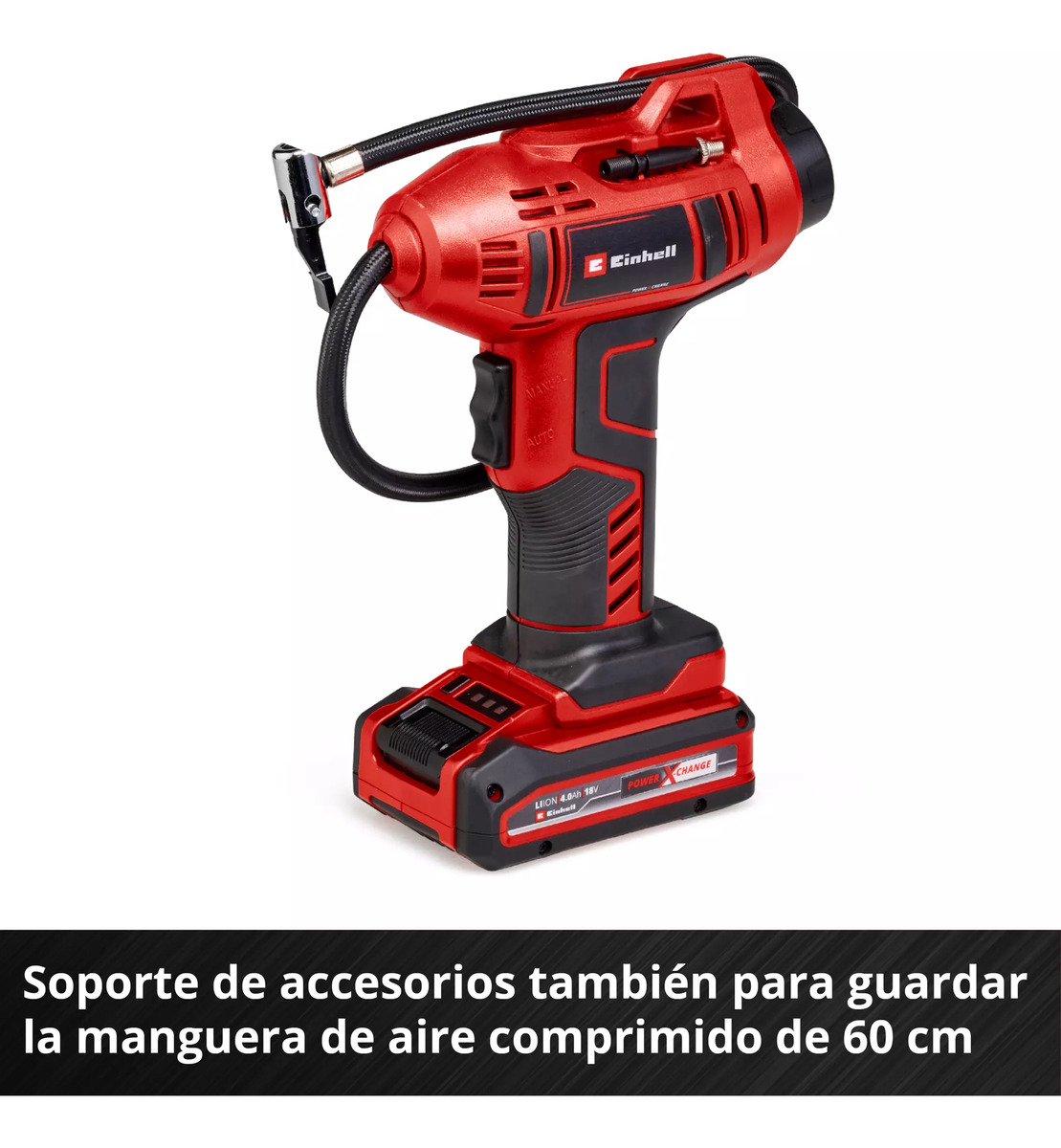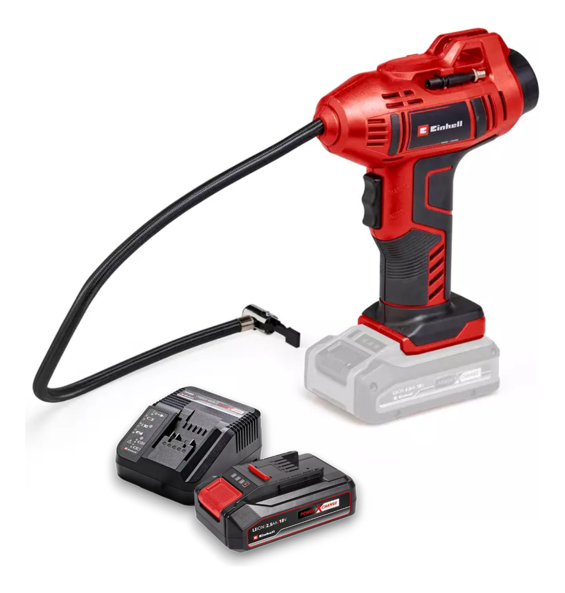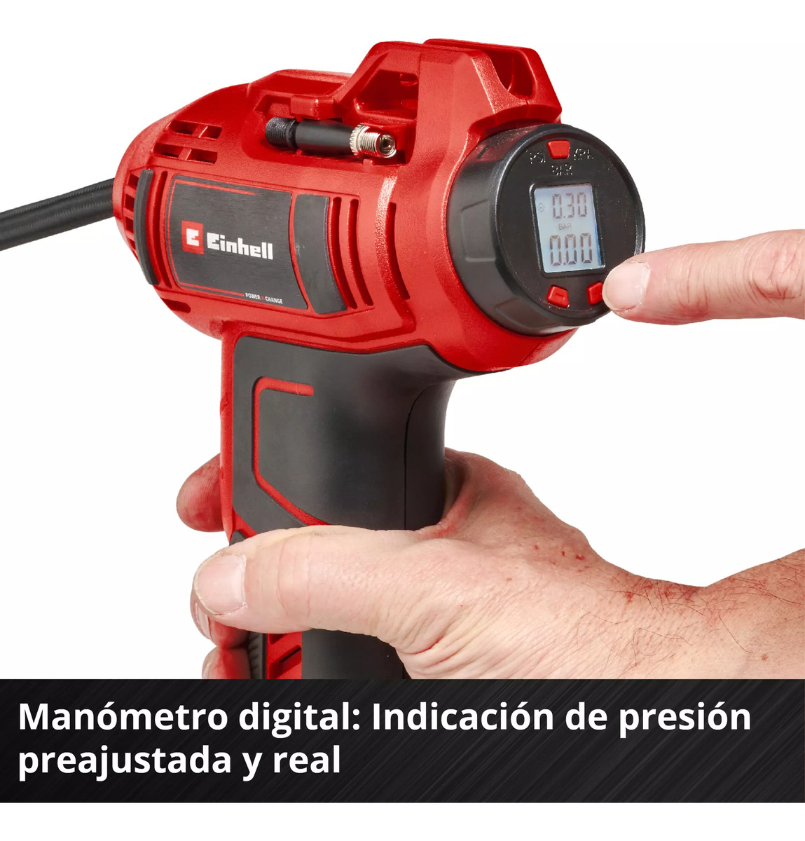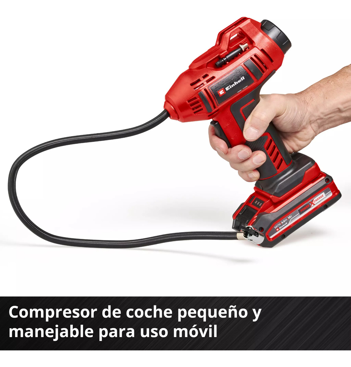 El compresor de coche con batería CE-CC 18 Li-Solo de Einhell es un compresor especialmente ligero y manejable, que es ideal para trabajos menores como el inflado de neumáticos de coche, de ruedas o pelotas. Como miembro de la familia Power X-Change de alta calidad, cada batería de la potente serie de producto puede combinarse con el compresor de coche. El compresor de coche con batería dispone de un indicador de presión digital para lectura sencilla y rápida de los ajustes actuales. La presión deseada hasta como máximo 11 bares puede ajustarse sin esfuerzo. Al alcanzar la presión ajustada se desconecta automáticamente el compresor de coche. La selección entre bar, psi y kpa se realiza a través de botón. El inflado manual es posible en todo momento sin preajuste. El set adaptador de inflado de 3 piezas puede guardarse directamente en el compresor. Con el asa ergonómica se garantiza una comodidad de manejo elevada. En el envío se incluye una manguera de aire comprimido de 60 cm con válvula de neumático para el alcance flexible. El envío se realiza sin batería ni cargador, estos son adquiribles por separado, por ejemplo, como un práctico set para principiantes.