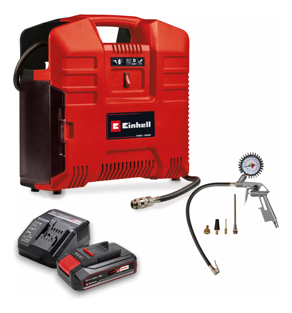El compresor de maletín con batería TE-AC 36/8 Li OF Set-Solo de Einhell pertenece a la potente familia Power X-Change. Las baterías con celdas de iones de litio de alta calidad se pueden combinar con todos los miembros de la familia Power X-Change. El compresor de maletín con batería es un ayudante pequeño pero potente para aplicaciones hasta como máximo 8 bares. Por tanto, es adecuado p. ej. para el inflado rápido de neumáticos de bicicleta, coche y moto. Los exigentes neumáticos de bicicleta de carreras no suponen ningún problema al compresor de maletín con batería gracias a su potente bomba. El diseño ergonómico y una empuñadura práctica aportan movilidad y un transporte sencillo. La bomba exenta de aceite y servicio solo necesita un pequeño coste de mantenimiento. En la carcasa está integrado el compartimento de almacenamiento para la manguera de aire comprimido. Una caja de almacenamiento adicional está prevista para el adaptador. El inflador de neumáticos puede guardarse cómodamente en la carcasa En el alcance del envío están contenidos una manguera de aire comprimido de 2,5 m con acoplamiento rápido, un adaptador para el uso como pistola de soplado, un inflador de neumáticos y un set adaptador de 3 piezas. El envío se realiza sin batería ni cargador, son adquiribles por separado. Para el funcionamiento del compresor de maletín se necesitan 2 baterías de 18 V Power X-Change.