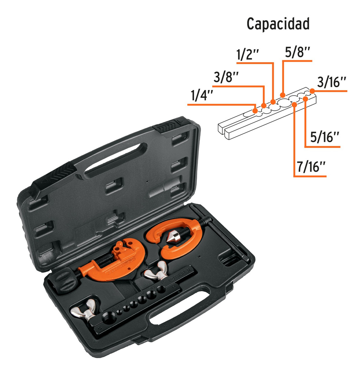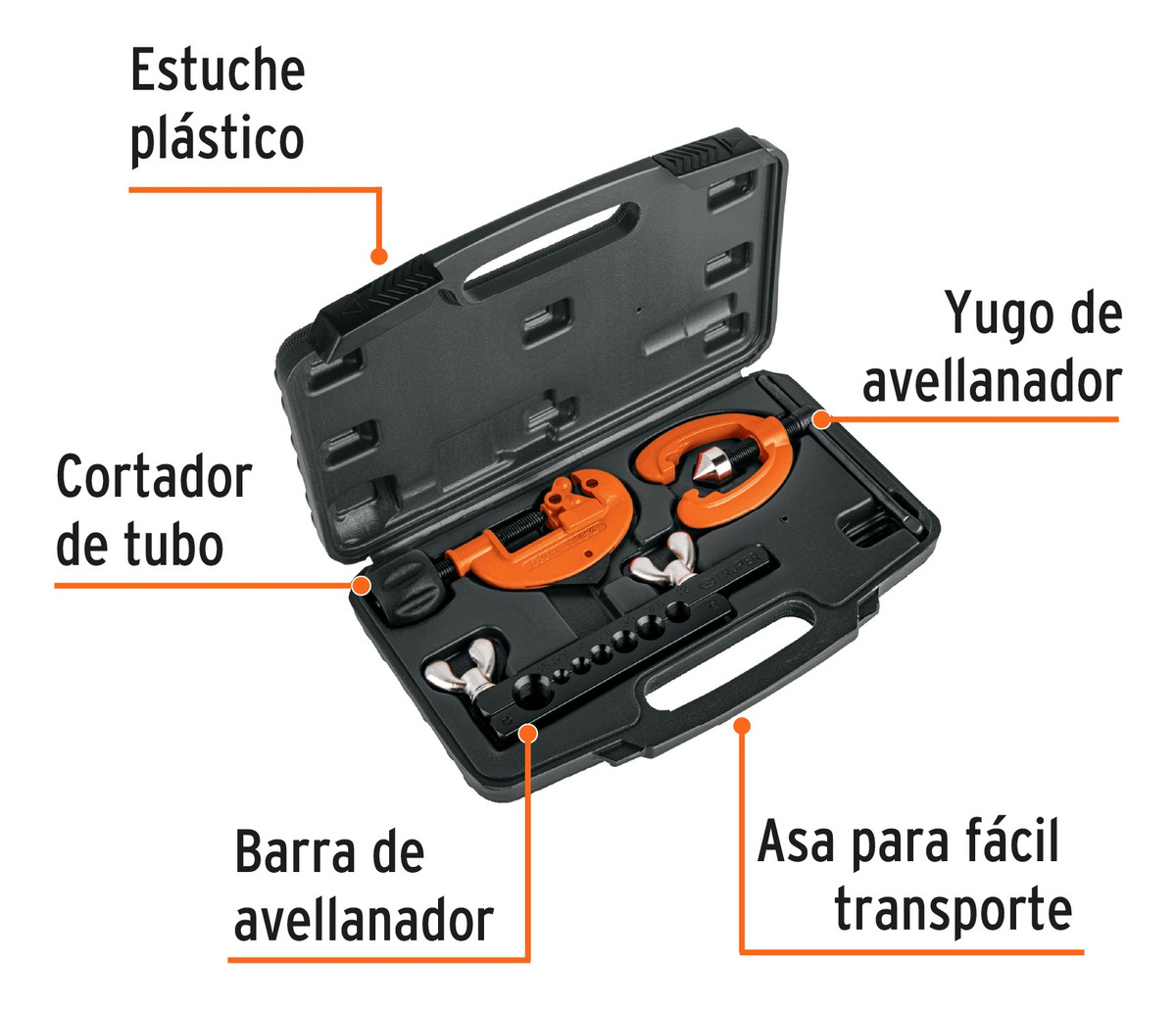 Con una capacidad de avellanador que abarca tubos de 3/16″, 1/4″, 5/16″, 3/8″, 7/16″, 1/2″ y 5/8″, podrás adaptarte a diferentes tamaños de tubos sin ningún problema. Además, su cortador tiene una apertura que va desde 1/8″ hasta 1 1/8″ (3 – 29 mm), lo que te brinda la flexibilidad necesaria para cortar tubos de diferentes diámetros.