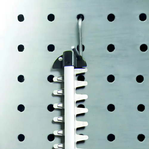 El protector contra impactos está provisto de un orificio para la fijación a la pared, lo que permite almacenar el cortasetos de forma rápida y ahorrando espacio.