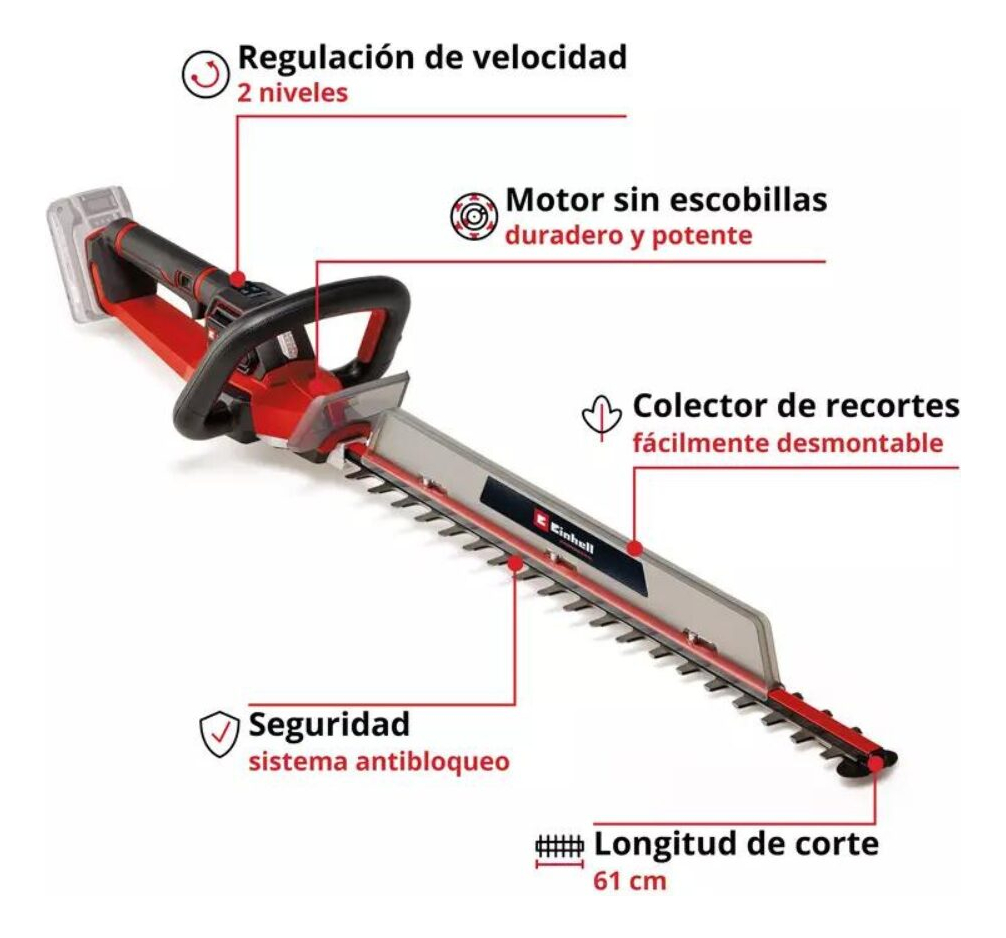 ¡Descubre la combinación perfecta de potencia y flexibilidad con el corta cercos inalámbrico GP-CH 18/61 Li BL-Solo de Einhell Professional! Diseñado para ofrecer un rendimiento sobresaliente, este cortasetos es parte de la avanzada familia Power X-Change de Einhell y funciona con una potente batería de iones de litio de 18 V, asegurando una libertad total sin cables. Equipado con el innovador motor sin escobillas PurePOWER de Einhell, el GP-CH 18/61 Li BL-Solo proporciona una potencia superior y una durabilidad extendida en comparación con los motores tradicionales con escobillas de carbono. Registra tu herramienta online y disfruta de una garantía de 10 años. Con un peso ligero de solo 2,9 kg, este cortasetos es fácil de manejar y se adapta perfectamente a tu mano. Su empuñadura trasera giratoria y empuñadura frontal estrecha te permiten realizar cortes y moldeados precisos con facilidad. El duradero engranaje metálico asegura una transferencia eficiente de la potencia de la batería a las cuchillas de acero cortadas con láser y pulidas con diamante, que tienen una longitud de 61 y una distancia entre dientes de 26 mm, ideal para setos medianos a grandes. La longitud total de la espada es de 67 , permitiéndote cortar incluso las ramas más difíciles con eficacia. El cortasetos ofrece dos niveles de velocidad: el modo ECO para una mayor duración de la batería y el modo MAX POWER para un corte rápido y potente, incluso en ramas gruesas. Además, el sistema antibloqueo garantiza seguridad y un rendimiento confiable durante el uso. La comodidad se completa con un colector de recortes extraíble que facilita la limpieza y una robusta carcasa de protección que preserva las cuchillas y asegura un transporte y almacenamiento seguro.