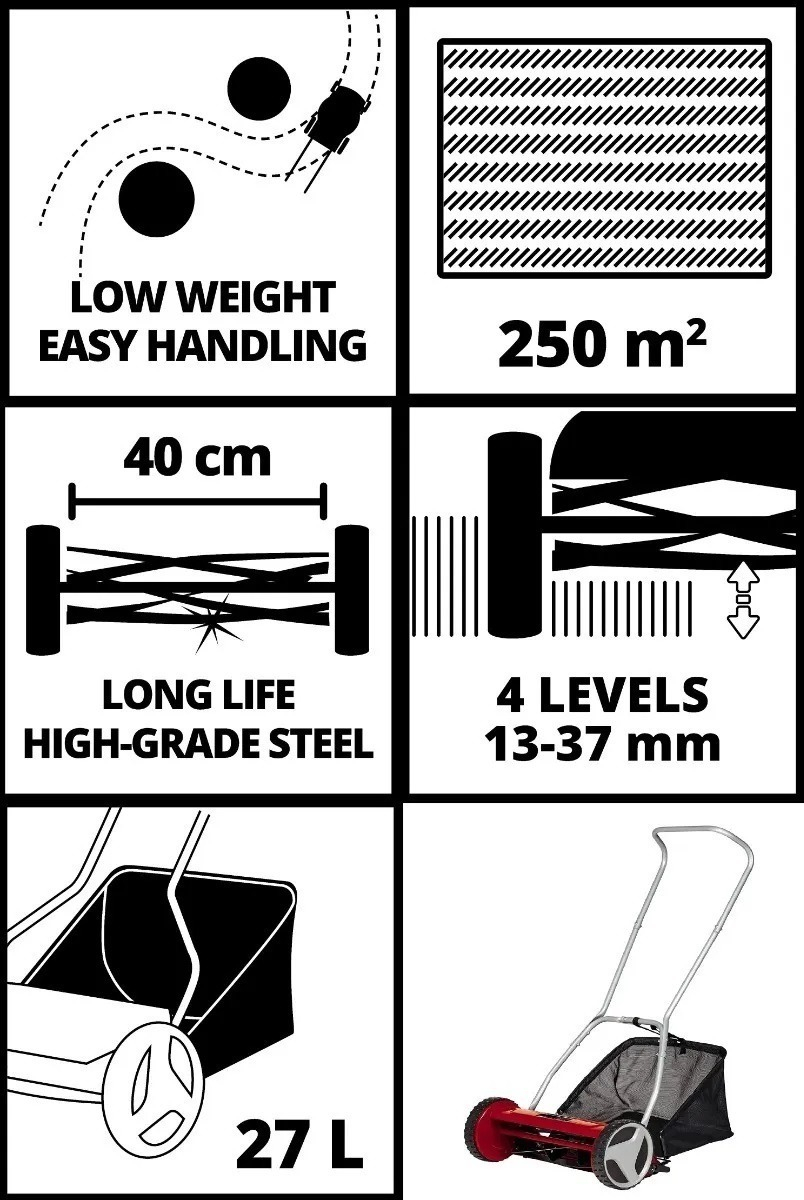 En resumen, el Cortacésped Manual con Cesta Colectora GC-HM 40cm de Einhell es una herramienta de jardín de alta calidad que combina funcionalidad, eficiencia y estilo. Ya sea que estés buscando mantener tu jardín en perfectas condiciones o simplemente quieras hacer tu trabajo de jardinería más fácil y agradable, este cortacésped es la elección perfecta.