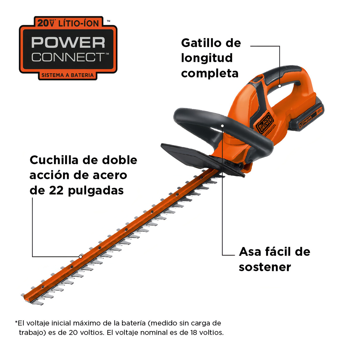 El Cortasetos Inalámbrico de 20V 55.8cm (22″) de Largo – 20V POWERCONNECT LHT2220-B2C BLACK+DECKER es un equipo de alto rendimiento y durabilidad. Viene con una Batería 20V POWERCONNECT y un cargador.