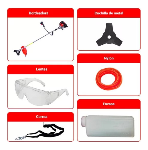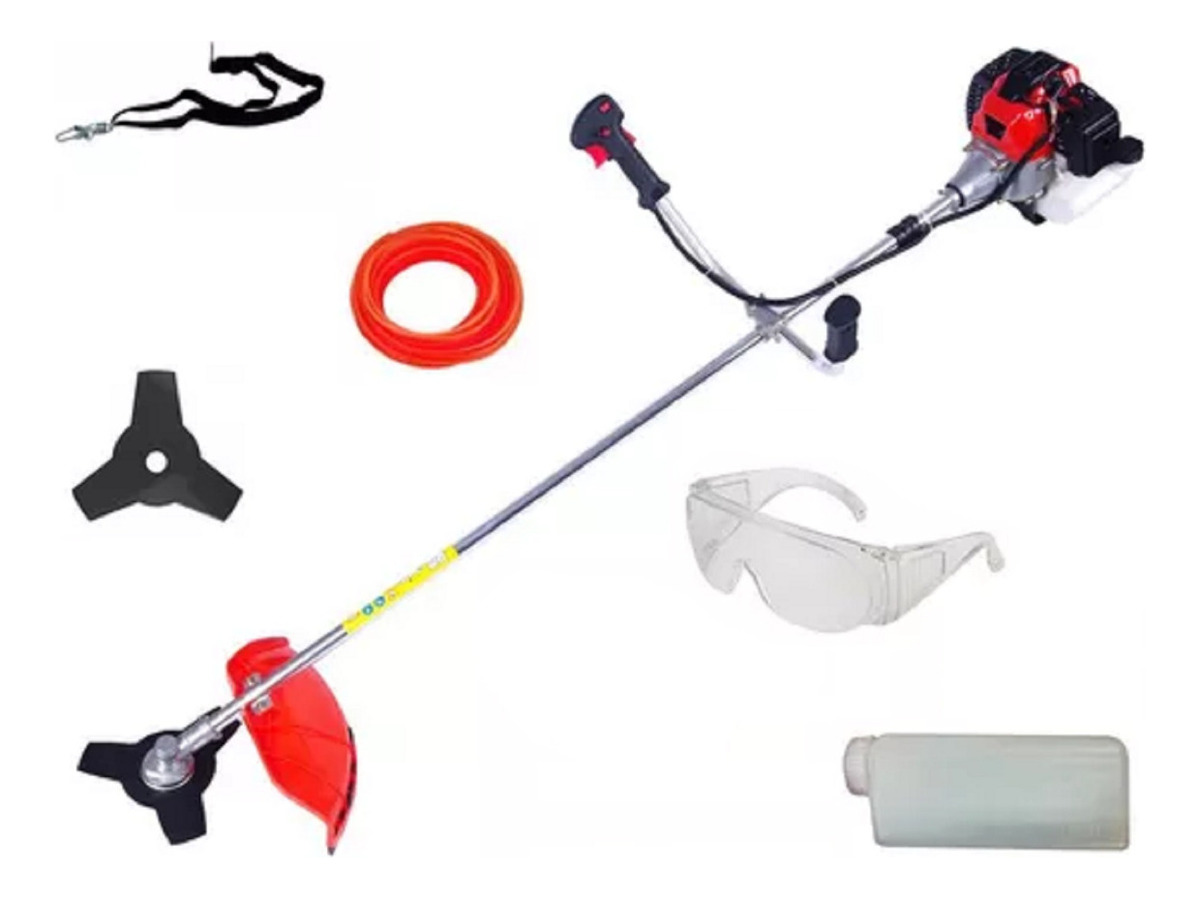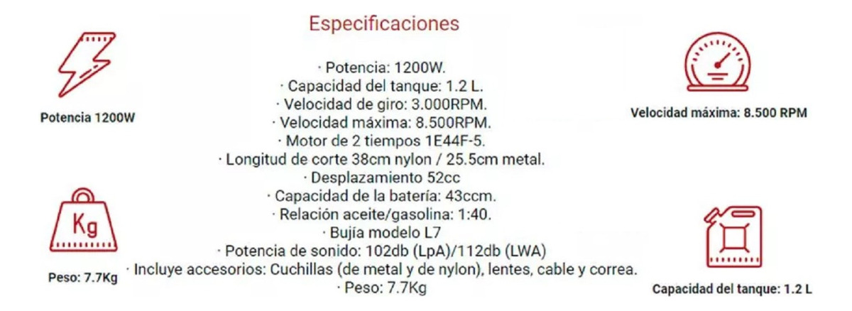 Una herramienta liviana de operación práctica y sencilla. Cuenta con 1200W de potencia, tanque de 1.2L de capacidad, motor de 2 tiempos y velocidad de giro 3000RPM. Incluye cuchillas de metal y de nylon, lentes, cable y correa.