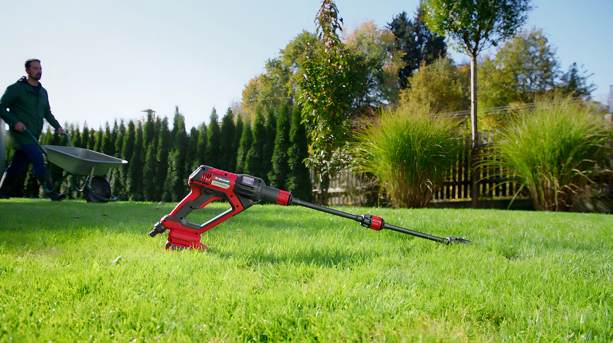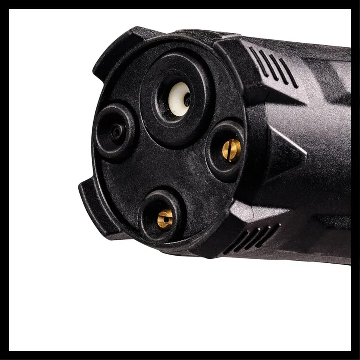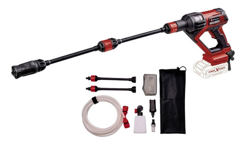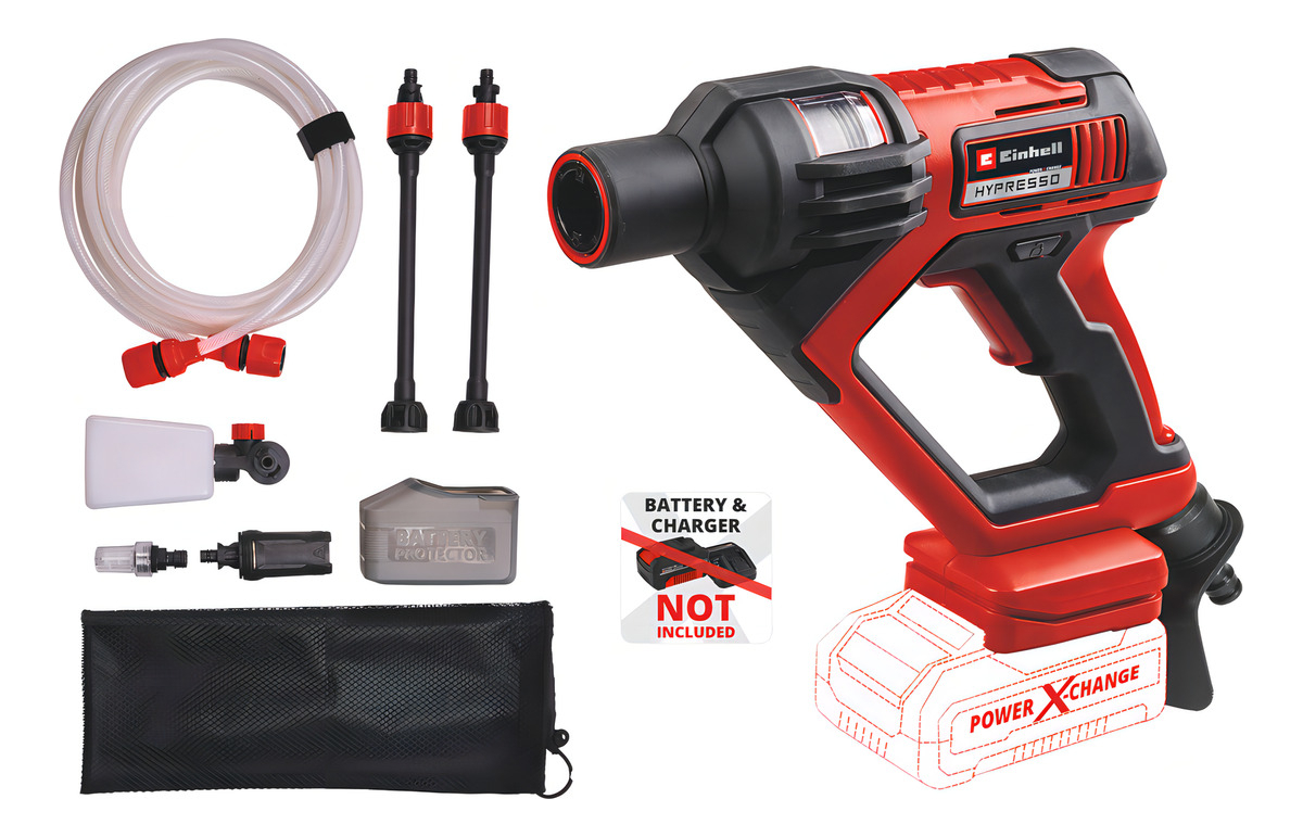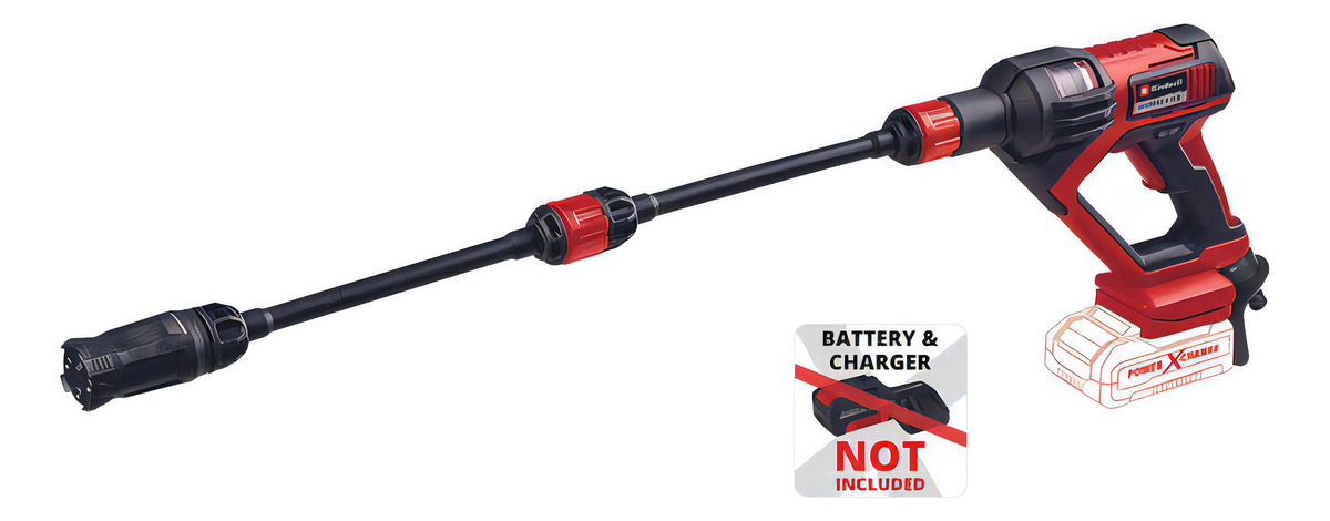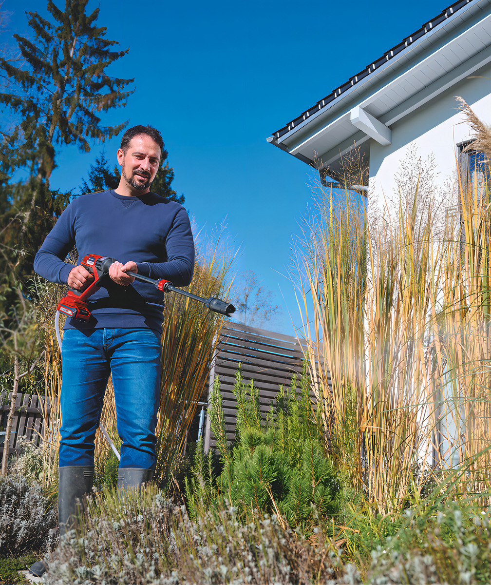 La hidrolavadora inalámbrica Einhell Hypresso 18/24 Li-Solo ofrece flexibilidad sin cables para limpiar y regar el jardín y la terraza. Forma parte de la familia Power X-Change, en la que todas las baterías, cargadores y dispositivos del sistema pueden combinarse entre sí de forma flexible. Funciona con 24 bares de presión y un caudal de hasta 240 litros de agua por hora. La duración de la batería de este dispositivo de limpieza compacto puede prolongarse con sólo pulsar un botón a través del modo Eco. Está equipada con una boquilla ajustable en 4 direcciones, a través de la cual se puede trabajar con chorro puntual o chorro ancho, así como con un chorro pulverizador para regar o el chorro giratorio para limpiar la suciedad más incrustada. Para pasar fácilmente de la limpieza al riego, la presión se puede regular directamente. No sólo puede conectarse a la manguera de jardín gracias a la conexión para manguera, sino que también puede aspirar agua de cubos, bidones o un estanque gracias al filtro de agua y la manguera de aspiración de 5 metros incluidos. También se incluyen en el volumen de suministro dos lanzas de extensión, una botella pulverizadora de espuma, ideal para lavar coches, y una bolsa de red para guardar los accesorios. También se incluye un protector contra salpicaduras que simplemente se coloca sobre la batería Power X-Change para una protección adicional contra la humedad.