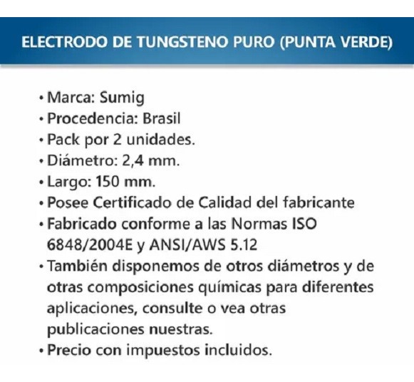 Electrodo Tungsteno Puro Verde 2,4 Mm Sumig Tig – Tyt