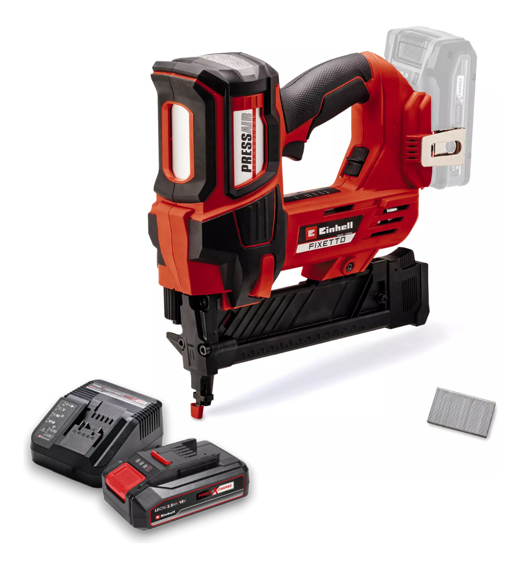 La clavadora con batería FIXETTO 18/40 S Einhell Professional es un potente ayudante en trabajos de renovación y decoración. Sea al tapizar muebles, clavar paneles de madera o fijar láminas, lonas o materiales aislantes – con la clavadora con batería puede seleccionarse según el esfuerzo de trabajo por regulador de tiro fácilmente entre tiro individual y en serie. Como miembro de la familia Power X-Change, la FIXETTO 18/40 S puede combinarse con todas las baterías y cargadores de la familia del sistema. El robusto engranaje y la tecnología PressAir sin mantenimiento posibilitan hasta 60 impactos por minuto, el ajuste de profundidad proporciona una profundidad de clavado variable y exacta de los clavos. El gran depósito está equipado con un indicador de nivel de llenado y tiene una capacidad de como máximo 100 clavos. Presionando un botón se puede abrir y rellenar de forma sencilla. La clavadora con batería puede usarse con clavos de 10 – 40 mm de longitud y 5,7 mm de espesor. La forma constructiva esbelta con superficies laterales de goma y agarre suave ergonómico confieren una manipulación agradable. La iluminación LED integrada en ambos lados en la carcasa aporta una iluminación óptima de la zona de trabajo. El envío se realiza incluyendo práctico clip de cinturón para el almacenamiento temporal seguro y 500 clavos. La nariz de seguridad impide un disparo involuntario de la clavadora y protege así de lesiones.