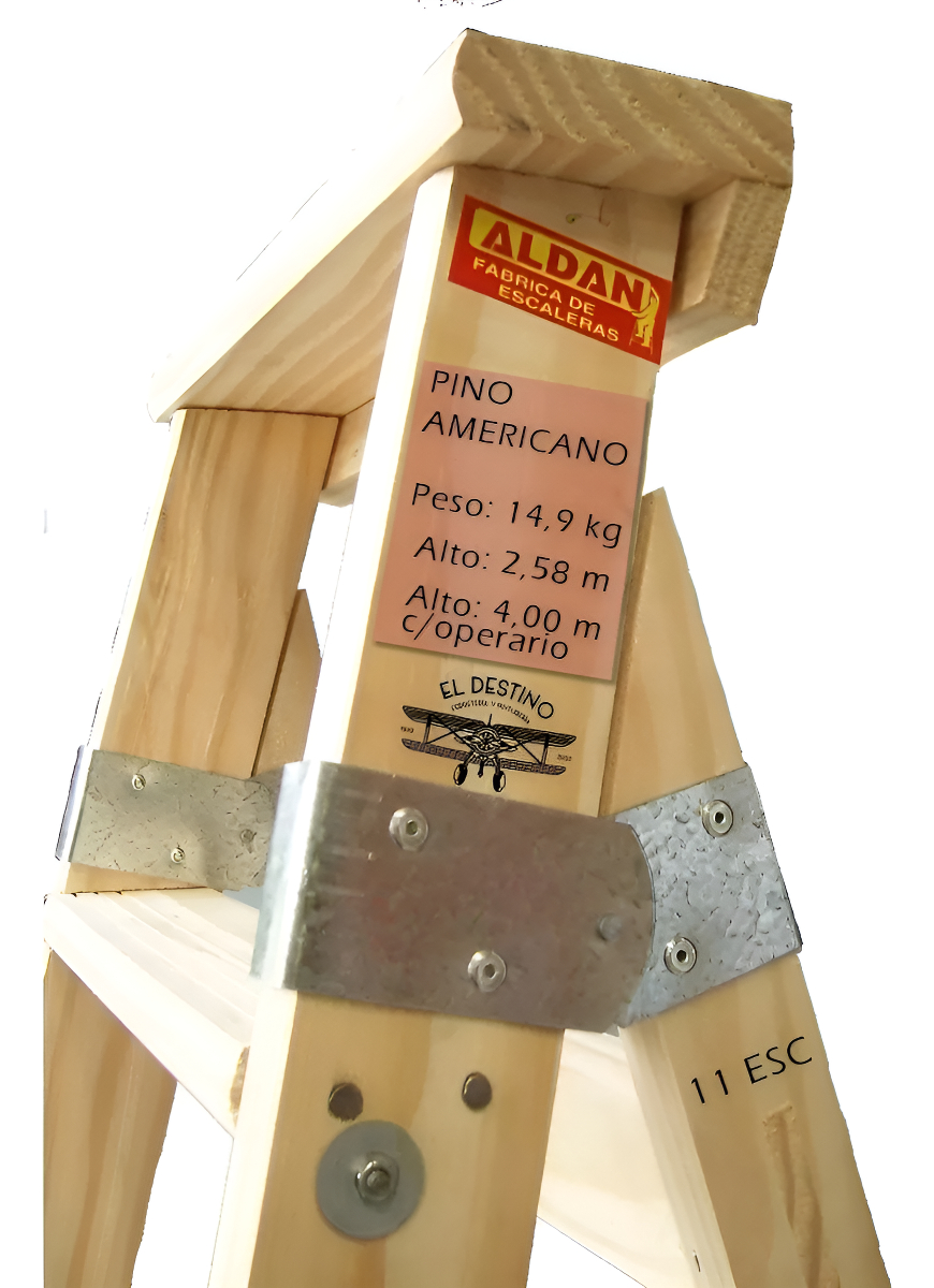 DESCRIPCIÓN: Escalera de tijera, con peldaños en posición vertical en ambas hojas, con tensores cilíndricos de seguridad emplazados debajo del peldaño, gancho soporte y bisagra especial con tope de apertura máxima.