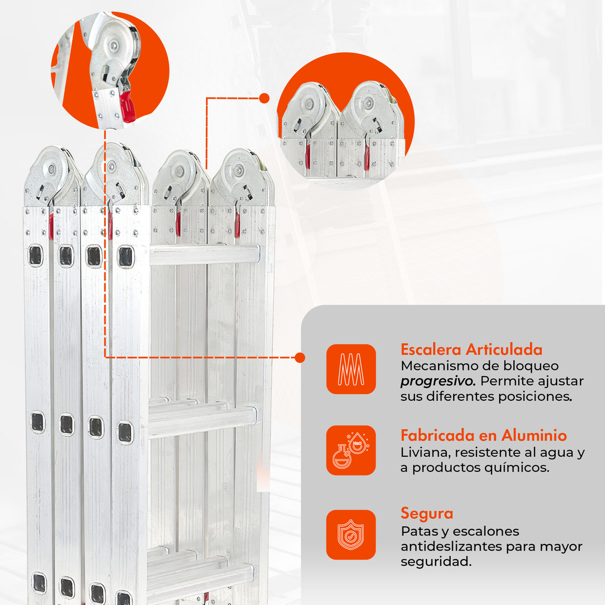 Accedé a sitios inalcanzables de manera práctica. Transportala y adaptala a tus necesidades ¡Ya no hay límites! Asegurá su posición sobre puntos sólidos y estables, y comenzá a utilizarla.