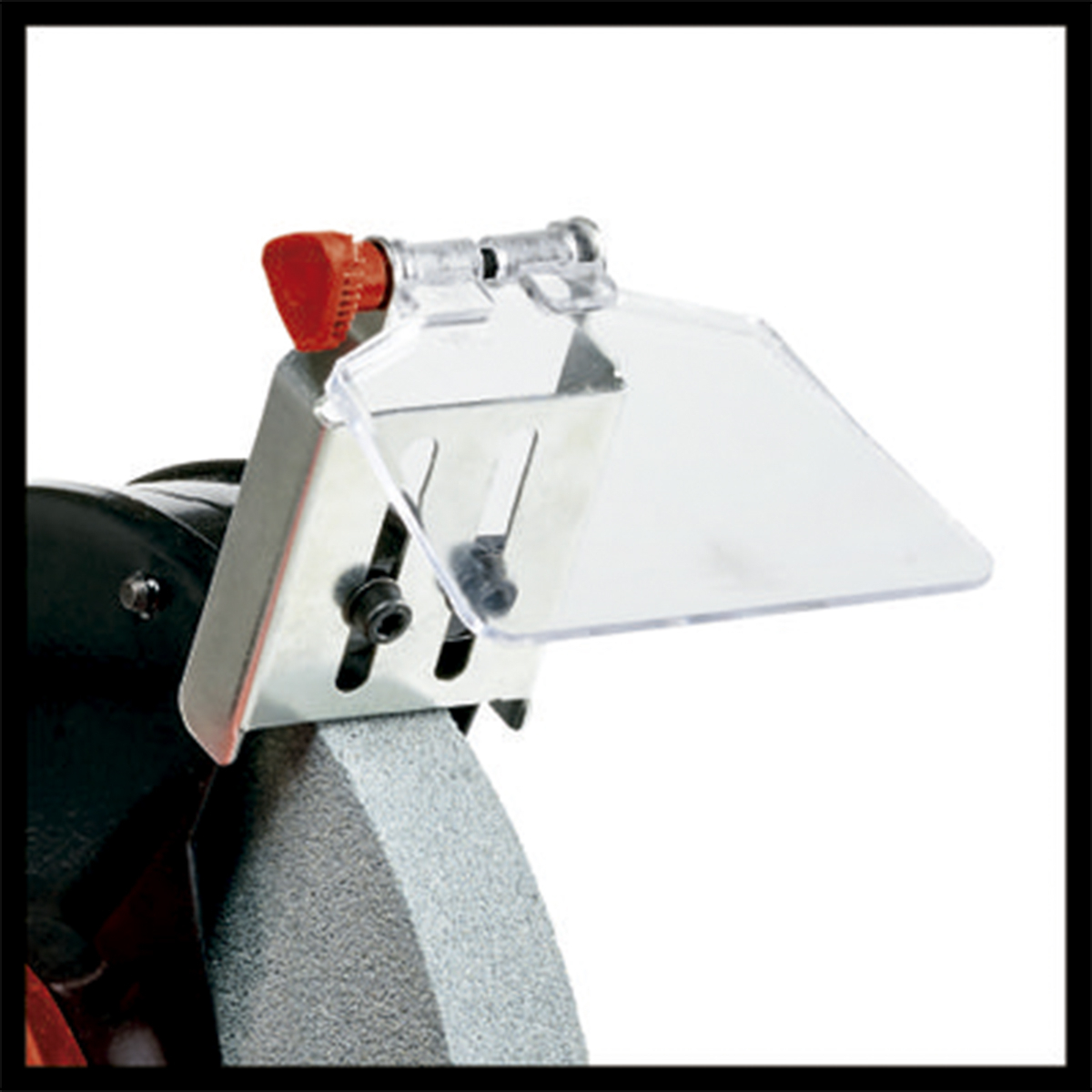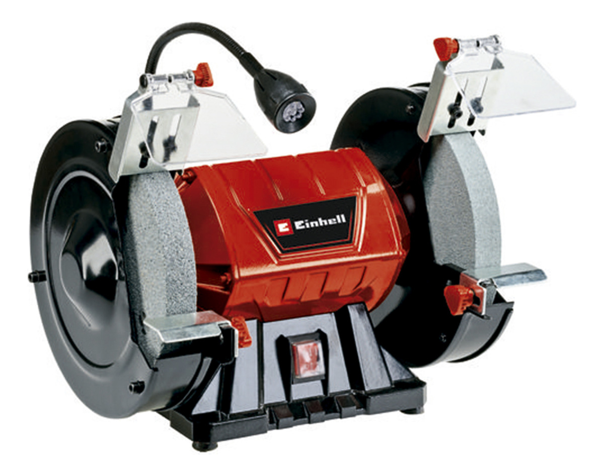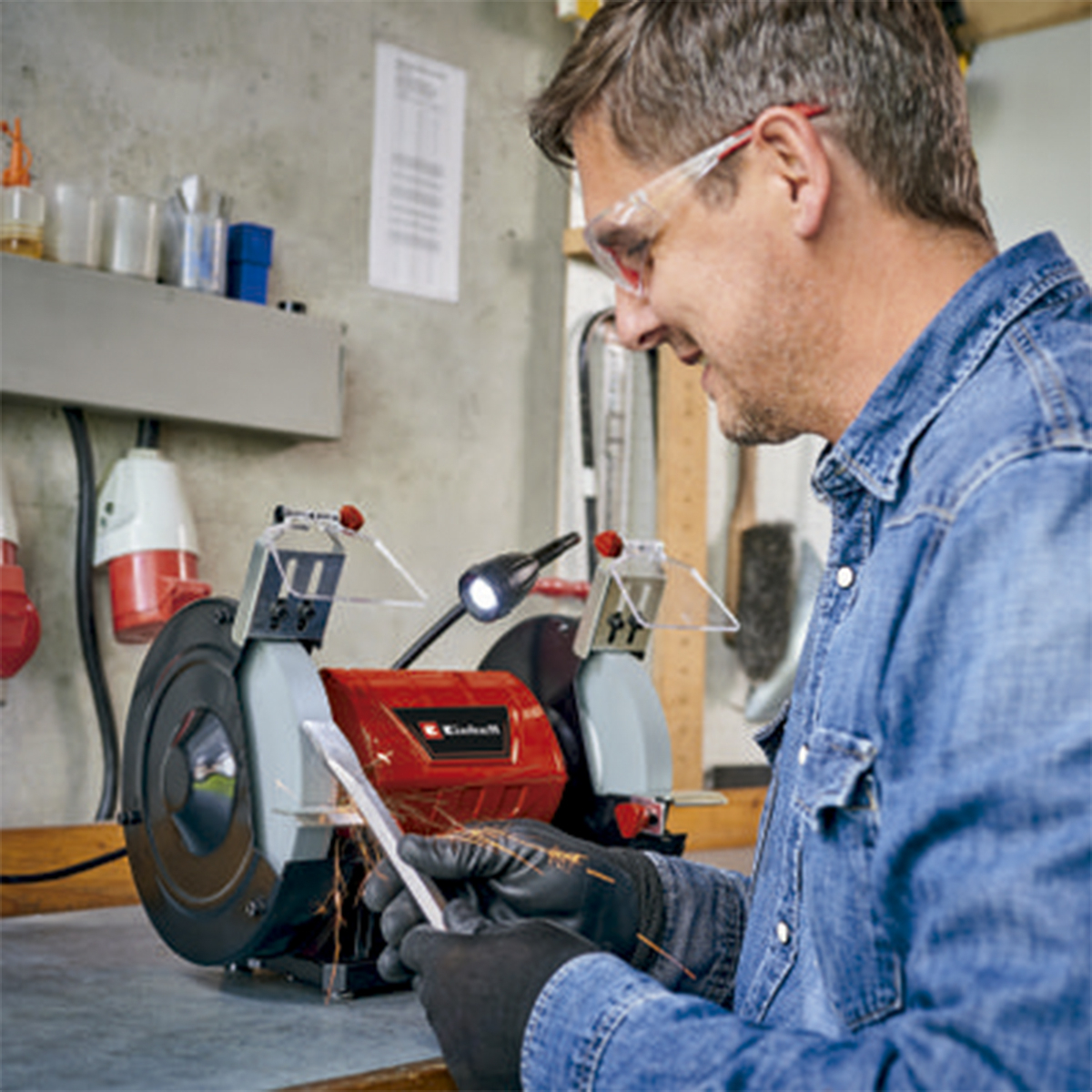 La esmeriladora doble TC-BG 200 L de Einhell es una práctica máquina rectificadora que se usa de forma versátil. Una esmeriladora doble – dos discos abrasivos, que se hacen funcionar cada vez por un motor – pertenece al equipamiento básico de un taller. Con una esmeriladora doble se pueden afilar tijeras, cuchillos y hojas, hojas de corte, brocas y fresas, incluso cinceles. Además, la esmeriladora doble se puede utilizar para la remoción de óxido y el desbarbado, para el lijado y pulido de distintas piezas de trabajo de madera, plástico y metal. La esmeriladora doble es especialmente apropiada para reparaciones sencillas y reafilados de cortes, pero también para fuertes reparaciones y correcciones de forma, así como nuevos afilados. Gracias a la luz LED pivotable pueden iluminar su puesto de trabajo, por lo que se garantiza la visión perfecta. El modo constructivo compacto y robusto de metal garantiza una larga vida útil de la amoladora. Los grandes apoyos de trabajo regulables ayudan en los diferentes campos de aplicación. Se posibilitan resultados precisos gracias a los árboles con rodamiento de bolas y sin juego. Los cristales protectores contra chispas ajustables sin herramientas y las cubiertas protectoras cerradas lateralmente garantizan la seguridad. Las cuatro patas de goma amortiguan las vibraciones y dan lugar a una posición vertical segura y fija durante el uso. En el envío está incluido un disco abrasivo basto y fino (K36/K60).