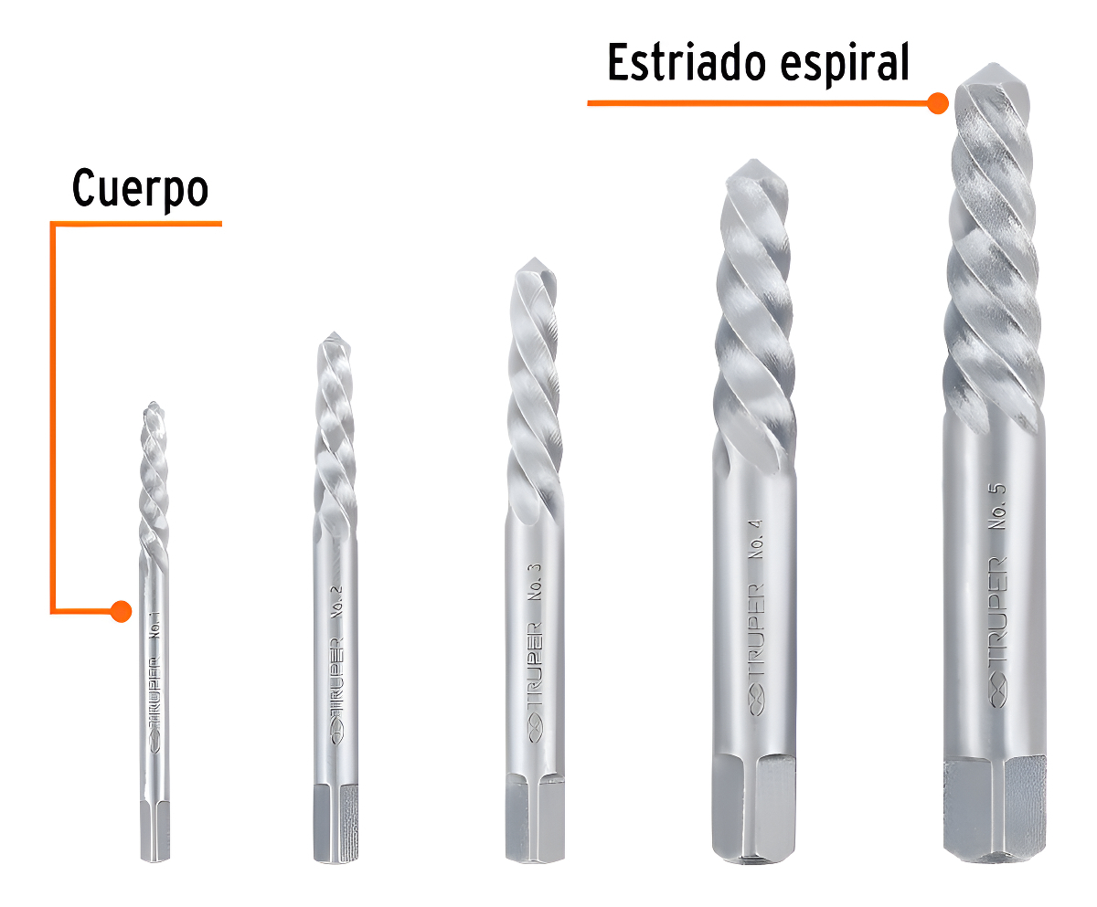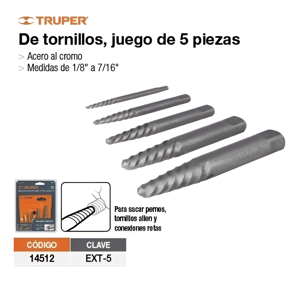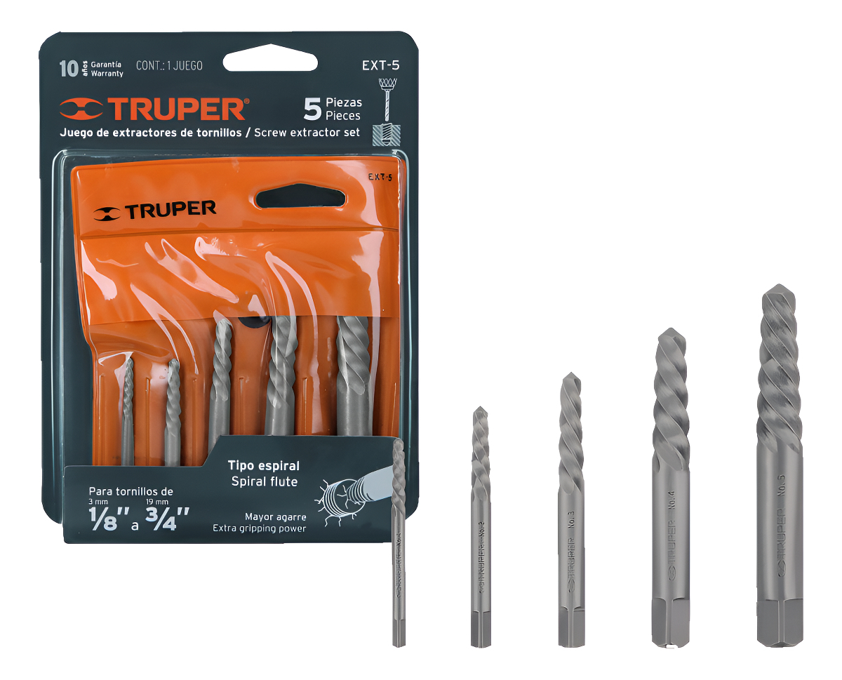 Ya sea que seas un profesional experimentado o un entusiasta del bricolaje, este extractor de tornillos Truper es una adición valiosa a tu conjunto de herramientas. No dejes que los tornillos dañados te detengan, adquiere el Extractor De Tornillos Dañados 5pc 1/83mm A 3/419mm Truper y mantén tus proyectos en marcha.
