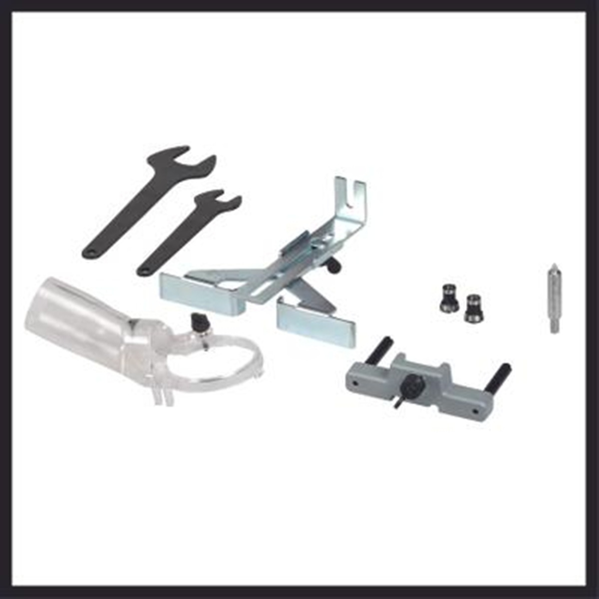 La fresa se envía con distintos accesorios como tope paralelo, rodillo guía, pinzas de sujeción y llave fija.