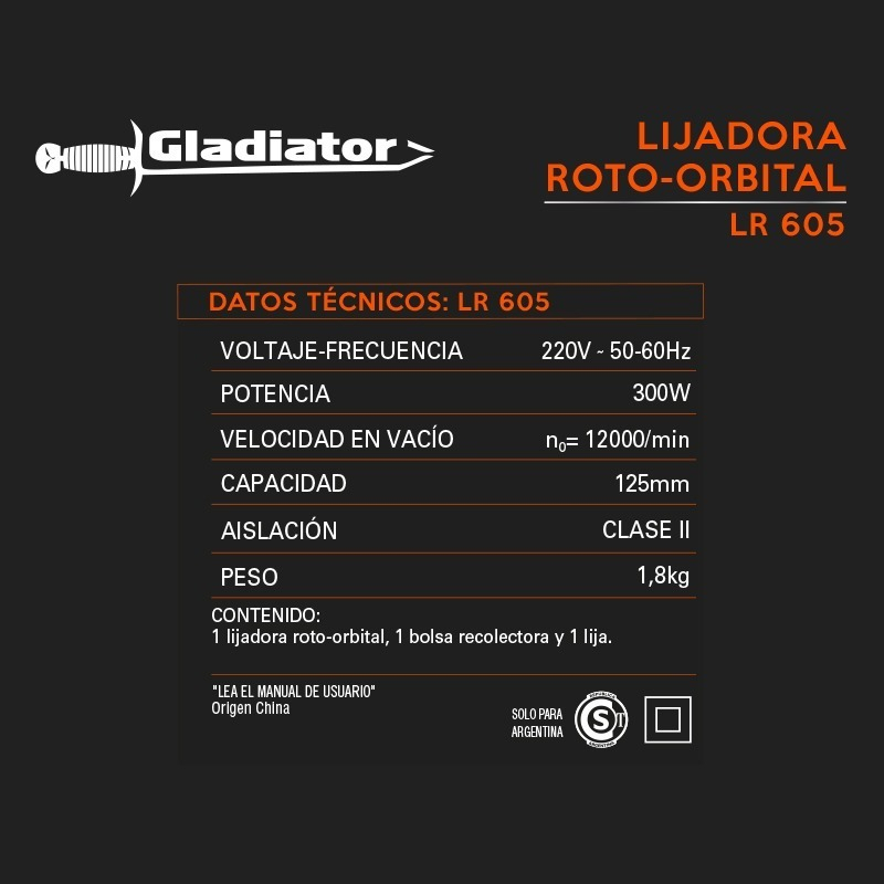 Ijadora Roto Orbital Gladiador Lr605 300w Lijas 125mm