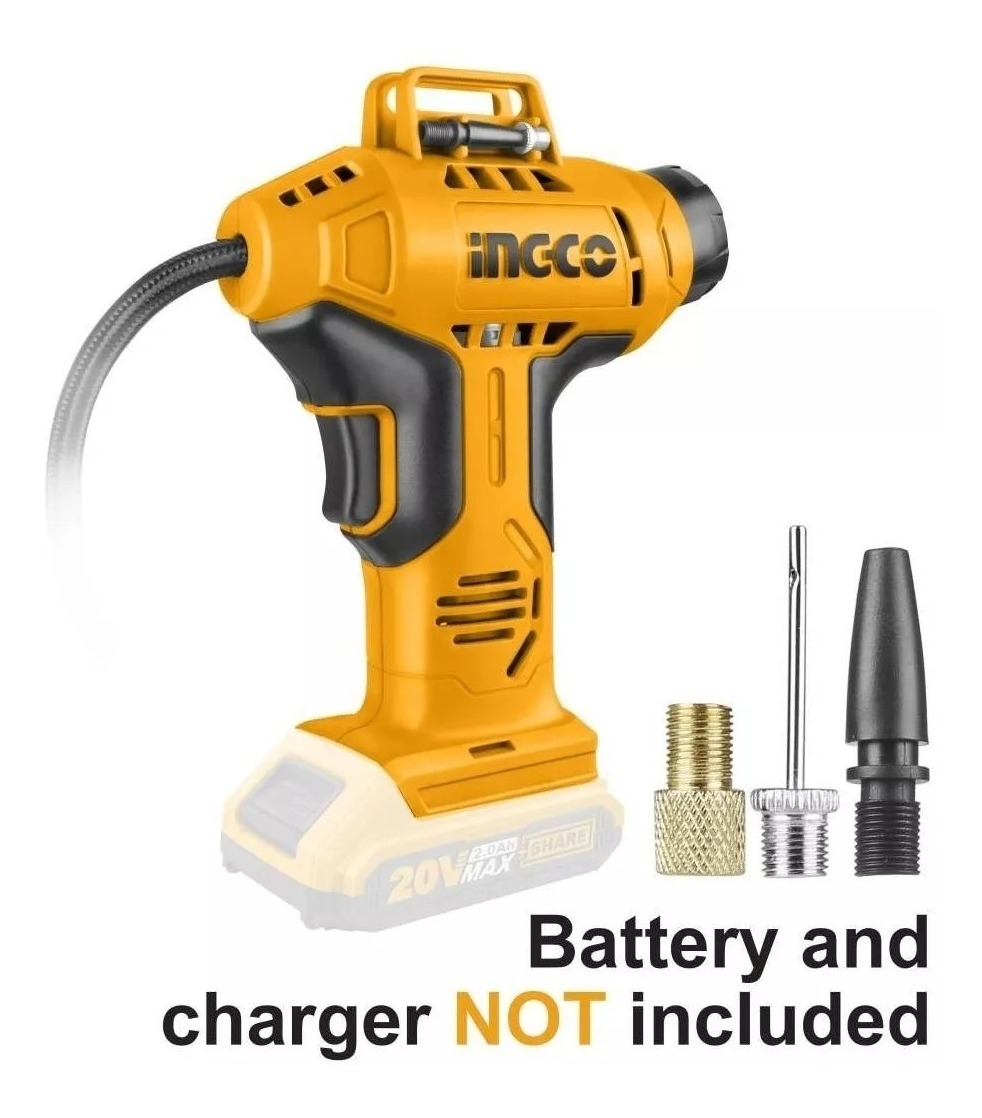 Voltaje: 20V Presión máx 150PSI / 10BAR Con adaptador de bola 1pza Con adaptador de vale de neumático 1pza No incluye batería ni cargador Embalado por caja de color