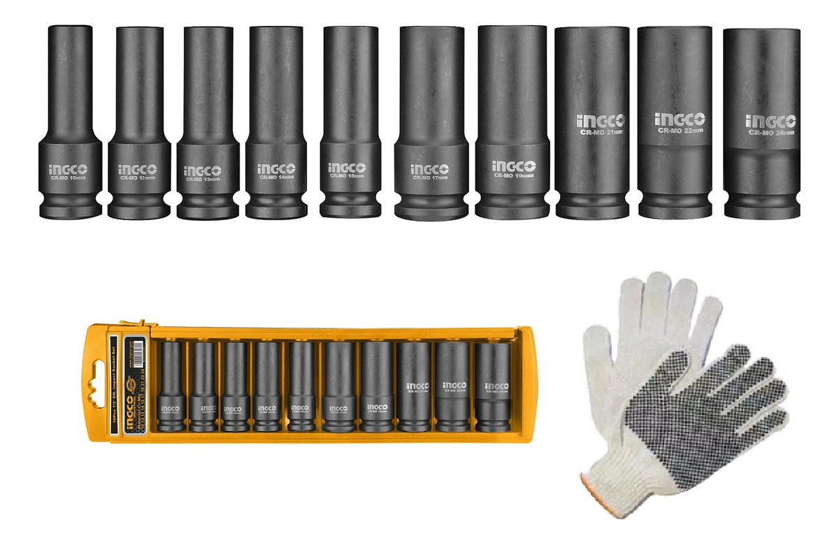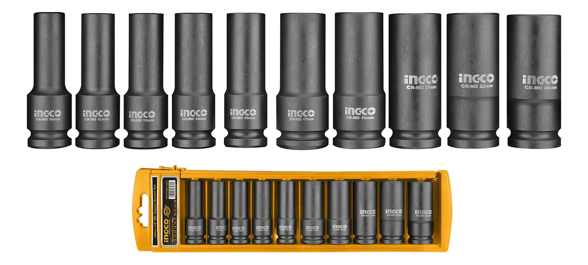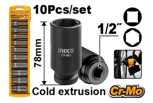 El Juego 10 Dados 1/2″ Impacto Profundos INGCO HKISSD12102L es una colección esencial para profesionales y aficionados que requieren herramientas de alta resistencia. Este juego incluye 10 piezas de llaves de dados de impacto profundo, diseñadas para trabajar con tuercas y pernos en espacios de difícil acceso. Cada dado tiene una longitud de 78 mm, lo que proporciona un alcance adicional para apretar o aflojar con precisión.