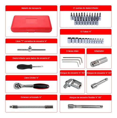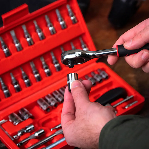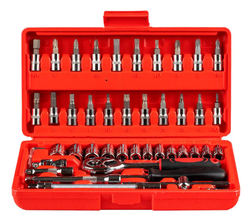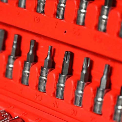 Para evitar cualquier desplazamiento, almacenamiento desordenado y sucio de tus herramientas, el juego de 46 piezas viene en un excelente estuche rojo. Con este estuche podrás mantener tus herramientas limpias y bien ordenadas ya que cada compartimento está moldeado para adaptarse a su pieza. Además, tiene los números de cada pieza escrita para ayudarte a localizar la que necesitás fácilmente.