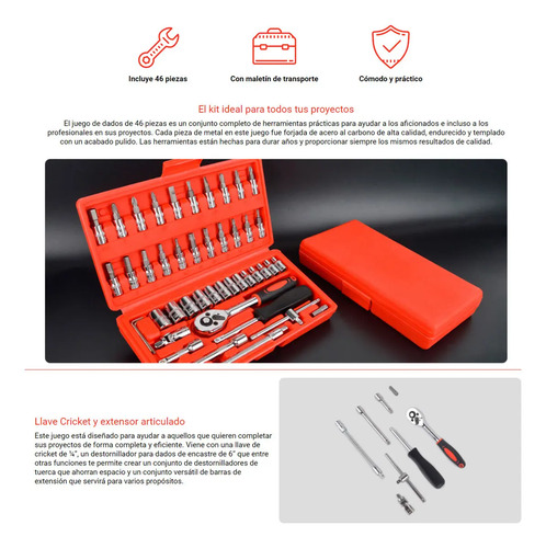 El juego de dados de 46 piezas es un conjunto completo de herramientas prácticas para ayudar a los aficionados e incluso a los profesionales en sus proyectos. Cada pieza de metal en este juego fue forjada de acero al carbono de alta calidad, endurecido y templado con un acabado pulido. Las herramientas están hechas para durar años y proporcionar siempre los mismos resultados de calidad.