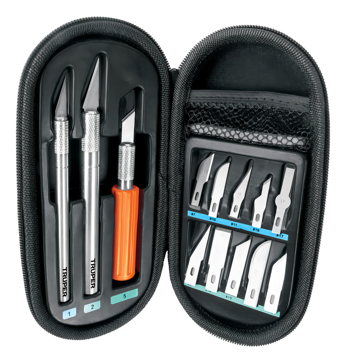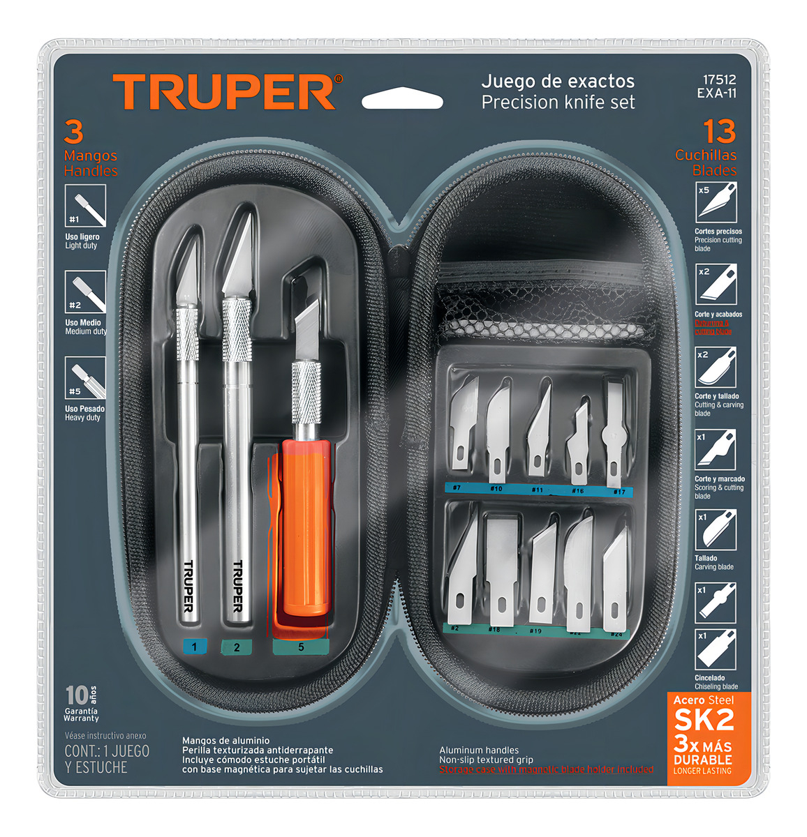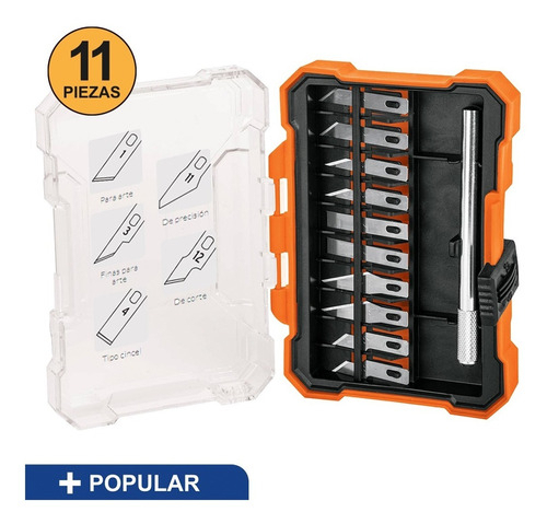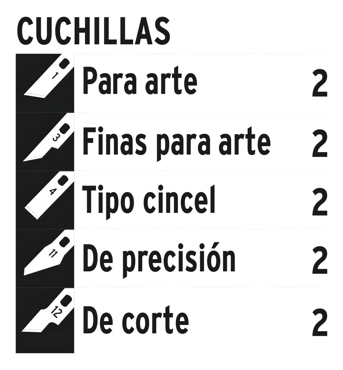 El estuche contiene 2 cuchillas para arte, 2 cuchillas finas para arte, 2 cuchillas tipo cincel, 2 cuchillas de precisión, 2 cuchillas de corte y 1 mango.