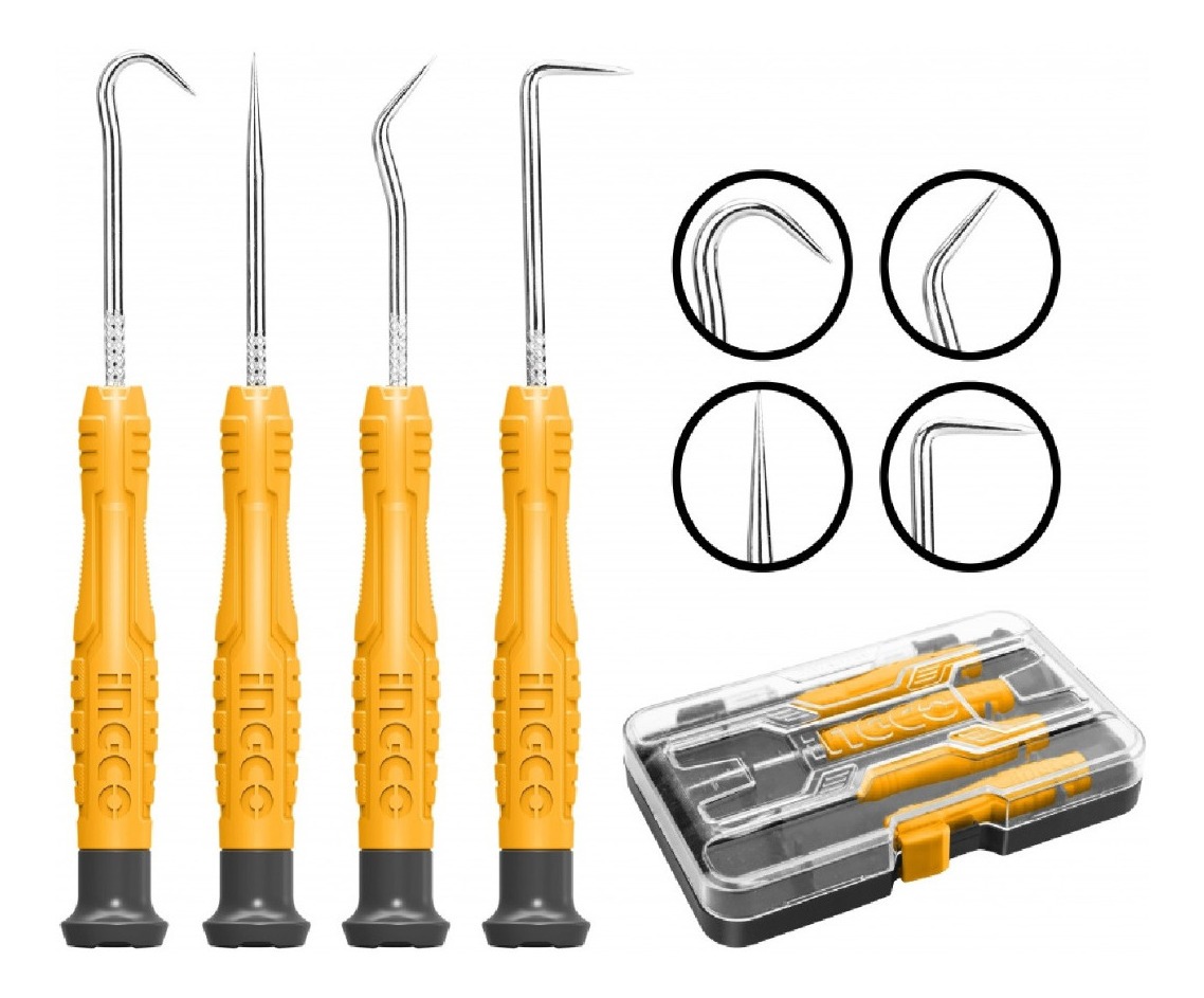 Juego de ganchos y ganzúas de 4 pza Mango de nuevo diseño INGCO Lista de productos 1 pza de gancho completo 1 pza de 45 grados 1 pza de 90 grados Selección recta de 1 pza Embalado por caja de plástico