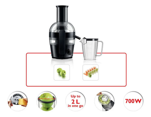 La boca de alimentación extra ancha facilita el uso con distintos tipos de frutas y verduras, sin necesidad de cortarlas previamente gracias a su tubo de 75 mm de diámetro.