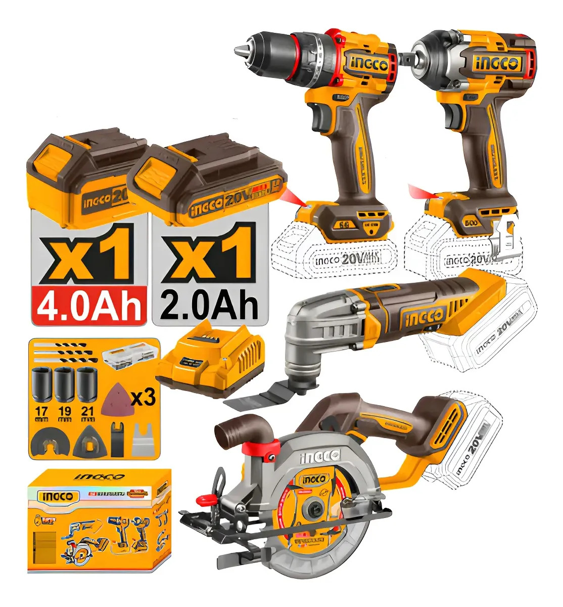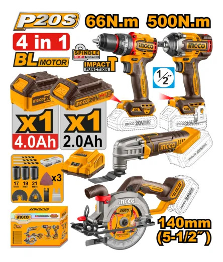 KIT A BATERIA P20S 20V 4 PIEZAS BRUSHLESS MOTOR C/2BAT, CARGADOR Y ACCESORIOS