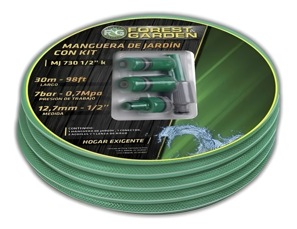 Contenido: 1 manguera de jardín, 1 conector, 2 acoples, 1 lanza de riego