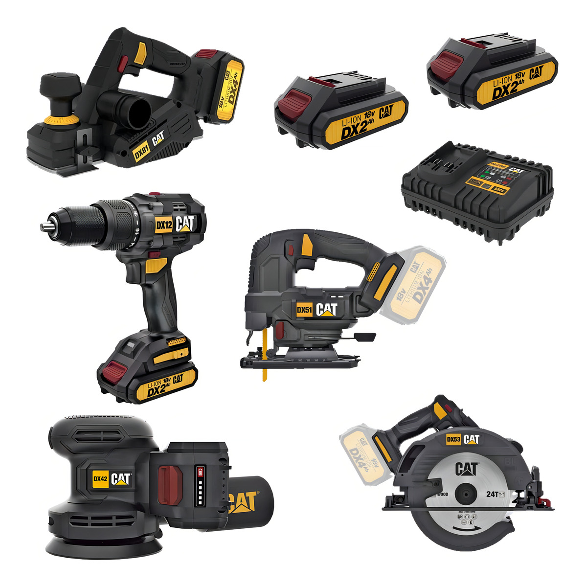 Kit Herramientas Cat Taladro Atornillador + Sierra Circular + Caladora + Garlopa + Lijadora + 2 Baterías 2Ah + Cargador
