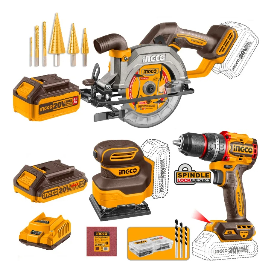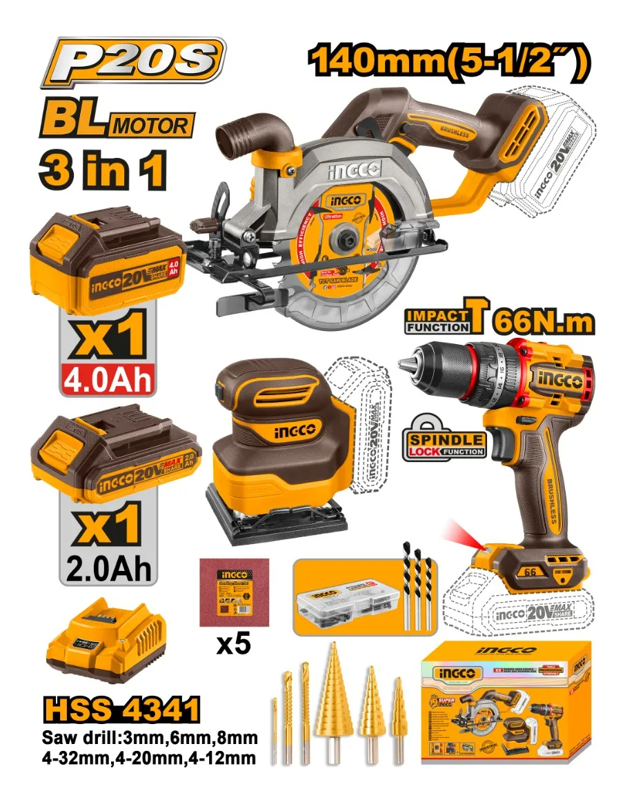 KIT COMBO A BATERIA P20S 20V SIERRA CIRCULAR + TALADRO ATORNILLADOR C/PERCUTOR + LIJADORA C/2 BATERIAS, CARGADOR Y ACCESORIOS