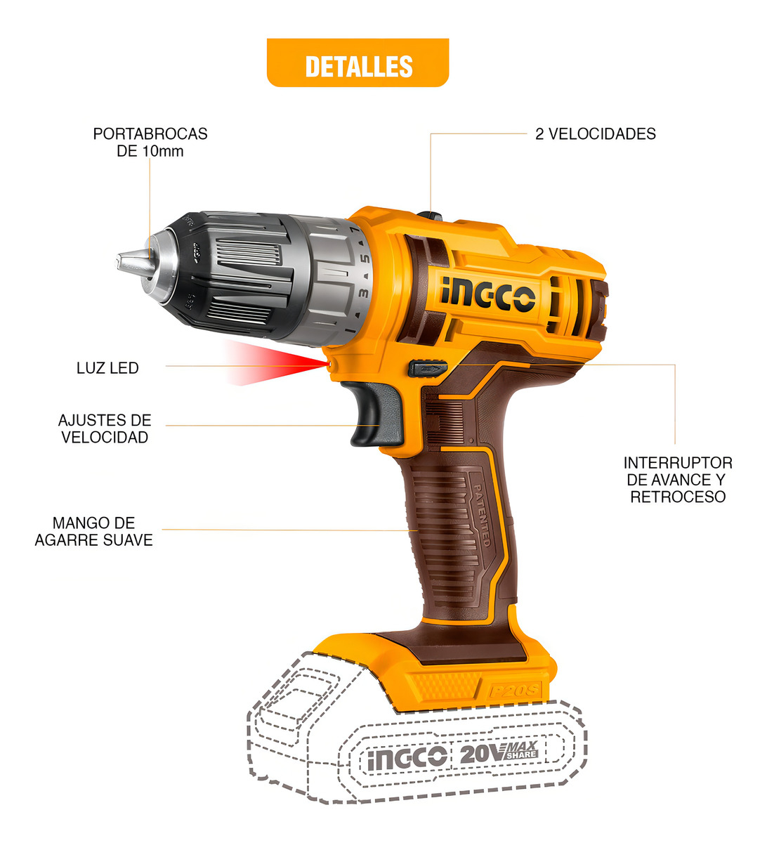 Taladro Atornillador Ingco Batería 18v Niquel 10mm Cdt08180