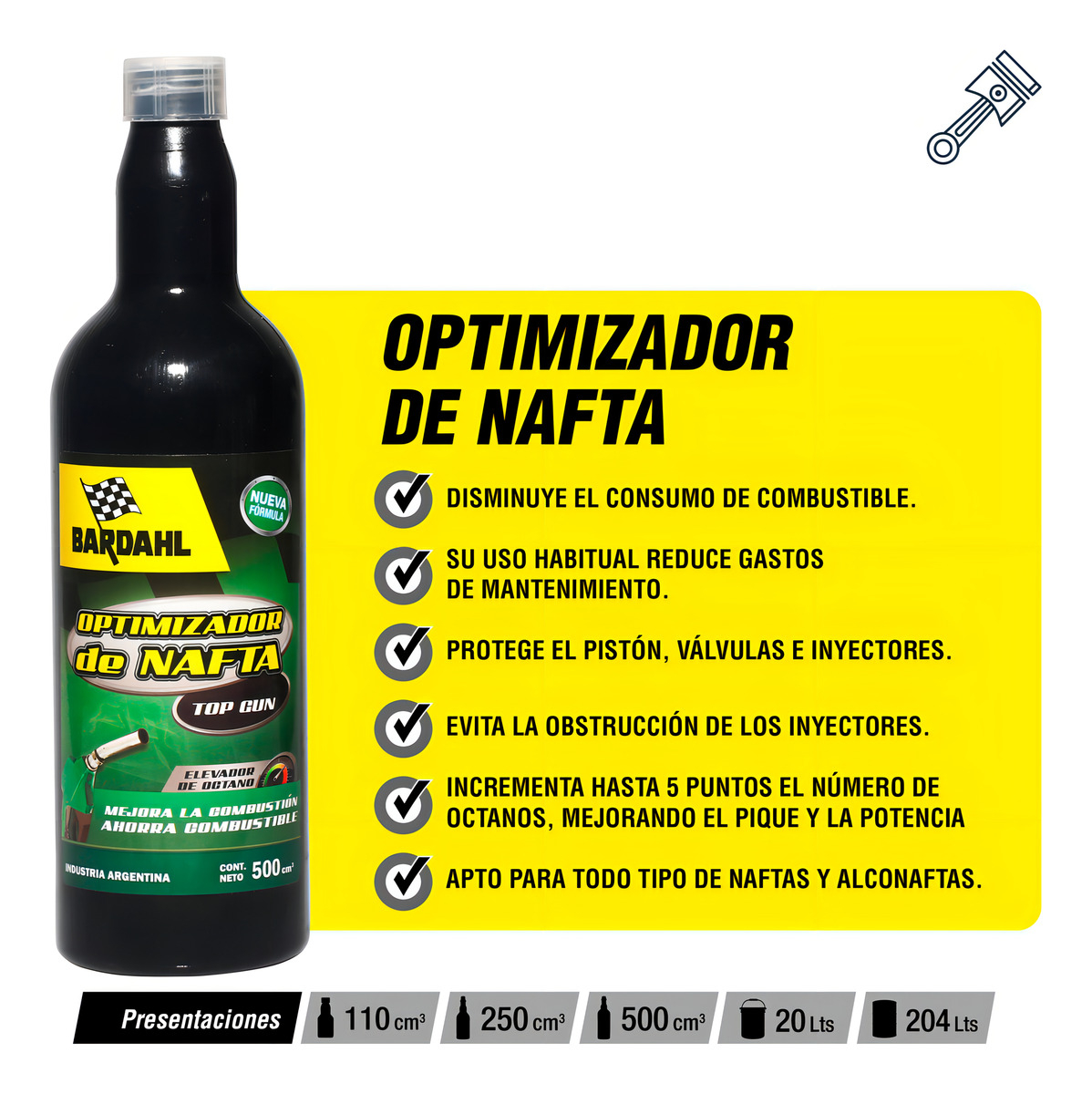 Optimiza el rendimiento del motor, mejora la combustión y disminuye el consumo de combustible. Incrementa hasta 5 puntos el número de octanos, evita obstrucciones en los inyectores y protege contra la corrosión. También prolonga la vida útil de las bujías y filtros, y reduce la emisión de gases contaminantes.