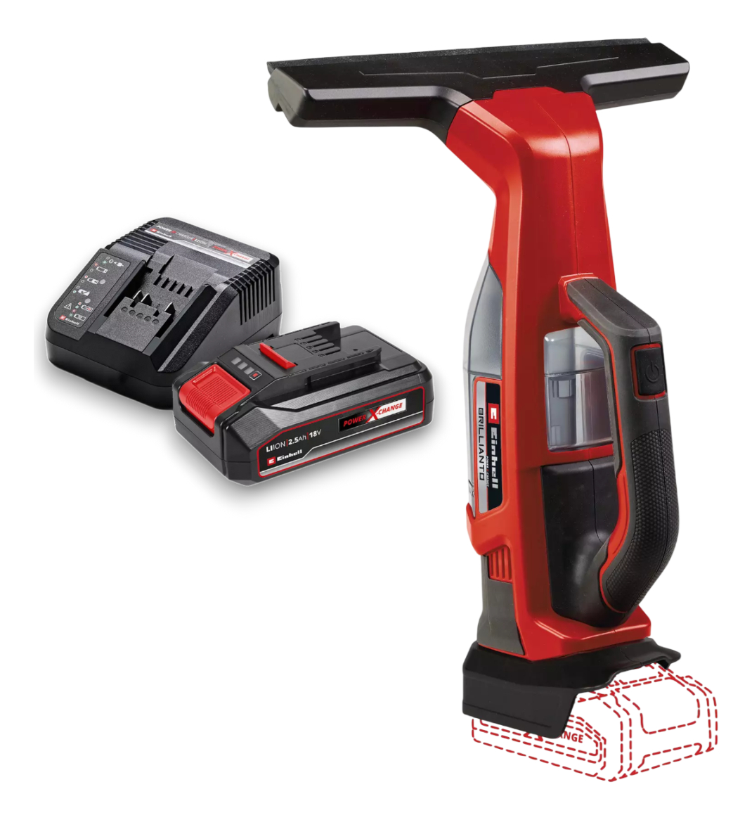 Ventanas limpiadas en un tris sin tiras – esto es el ejercicio más fácil para el limpiacristales con batería BRILLIANTO con batería de Einhell. Como parte de la familia Power X-Change, el limpiacristales inalámbrico puede combinarse con todas las baterías y cargadores. Limpiar ventanas sin cables sin interrupciones: Lo permiten el sistema de baterías extraíble Power X-Change y la tecnología de alta velocidad. Si la batería usada está vacía, puede cambiarse fácilmente por una llena – así no se le ponen límites a la duración. El limpiacristales con batería BRILLIANTO se envía junto con un pulverizador con volumen de 300 ml. En este se fija el paño de microfibras contenido en el alcance del envío para limpiar fácilmente superficies de cristal. Los restos del agua se recogen por el limpiacristales con ayuda de su boquilla de aspiración de 28 cm de largo. La interacción perfecta entre la boquilla y el labio nivelador de una pieza de silicona aporta resultados sin tiras – igual si se limpian las superficies de cristal en dirección horizontal, vertical o diagonal. Así el limpiacristales se vuelve un todoterreno y se usa no solo al limpiar ventanas, sino también en la limpieza de azulejos, duchas, mesas de cristal, cristales y ventanas en el coche, grandes frentes de ventana y mucho más. En el tanque de aguas sucias puede acumularse hasta 100 ml de líquido. El tanque debe retirarse completamente del equipo para el vaciado y limpieza. Con su diseño ligero y compacto con superficies especiales de agarre suave, el limpiacristales queda agradablemente en la mano sin correrse. Un interruptor on/off está equipado con una función de marcha permanente para trabajos de limpieza duraderos. El limpiacristales con batería se conserva fácil y ahorrando en espacio en el soporte de pared enviado. BRILLIANTO se proporciona sin batería ni cargador. Estos son adquiribles por separado, por ejemplo, como práctico set para principiantes. Como práctico accesorio para el limpiacristales con batería BRILLIANTO de Einhell están contenidos igualmente por separado un set de barras telescópicas para limpiar ventanas altas y un set de boquillas para limpiar superficies de cristal estrechas y grandes.