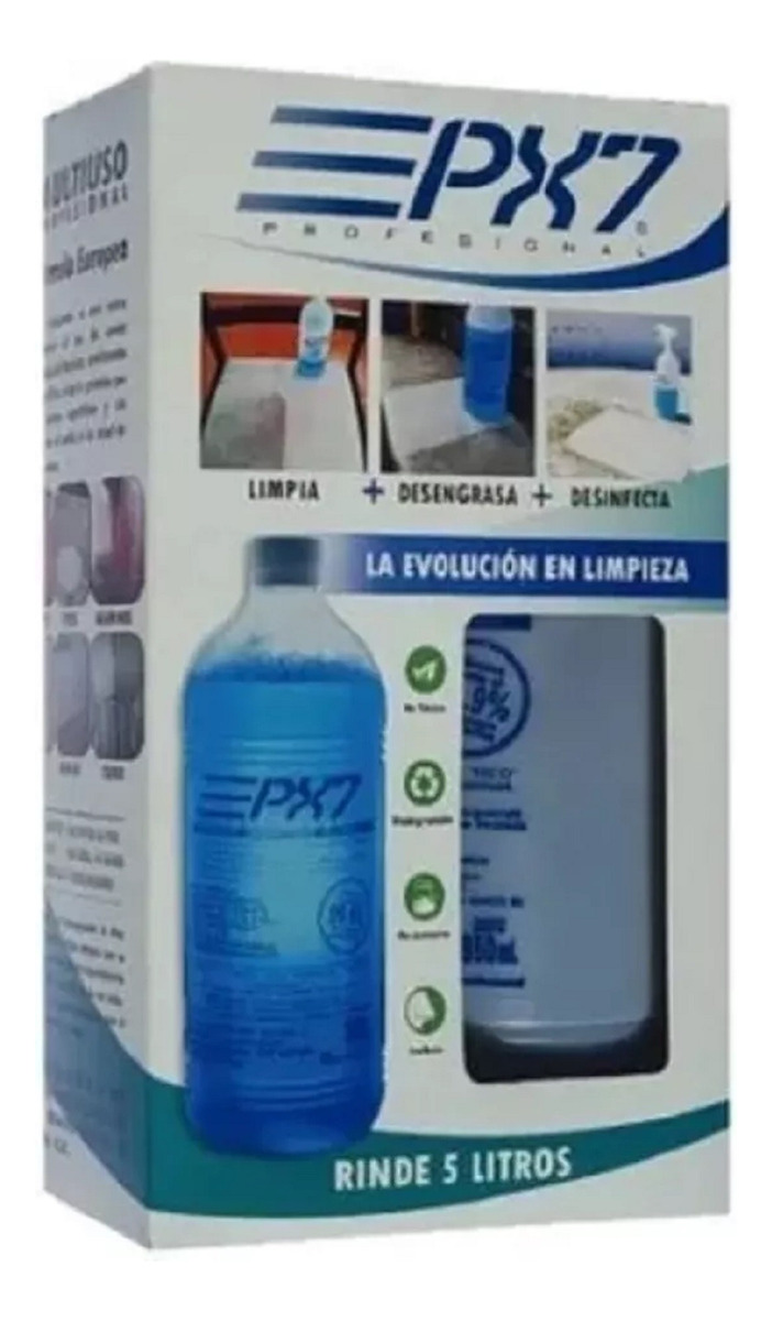 Px7 Multiuso es un detergente líquido concentrado, diseñado especialmente para desengrasar y desinfectar todo tipo de superficies lavables, cumpliendo los más estrictos parámetros de limpieza y sanitización profesional, sin perjudicar la salud de los usuarios ni dañar el medioambiente. Es el primer limpiador ecológico del mercado Uruguayo