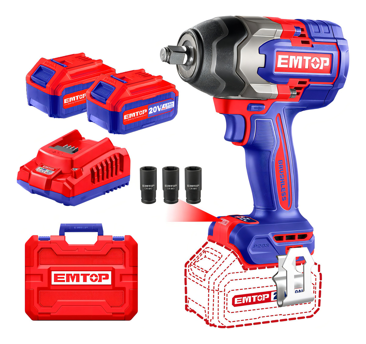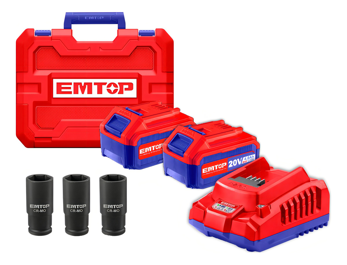 Llave De Impacto 850nm + 2 Baterias 4ah Y Cargador Emtop Color Rojo